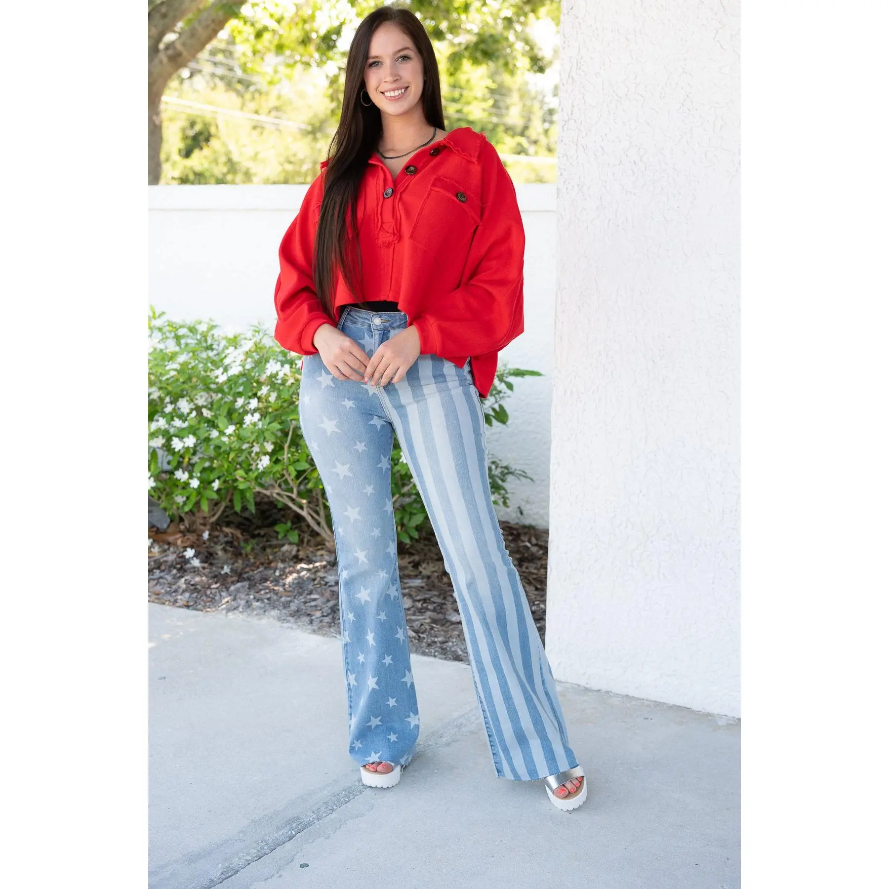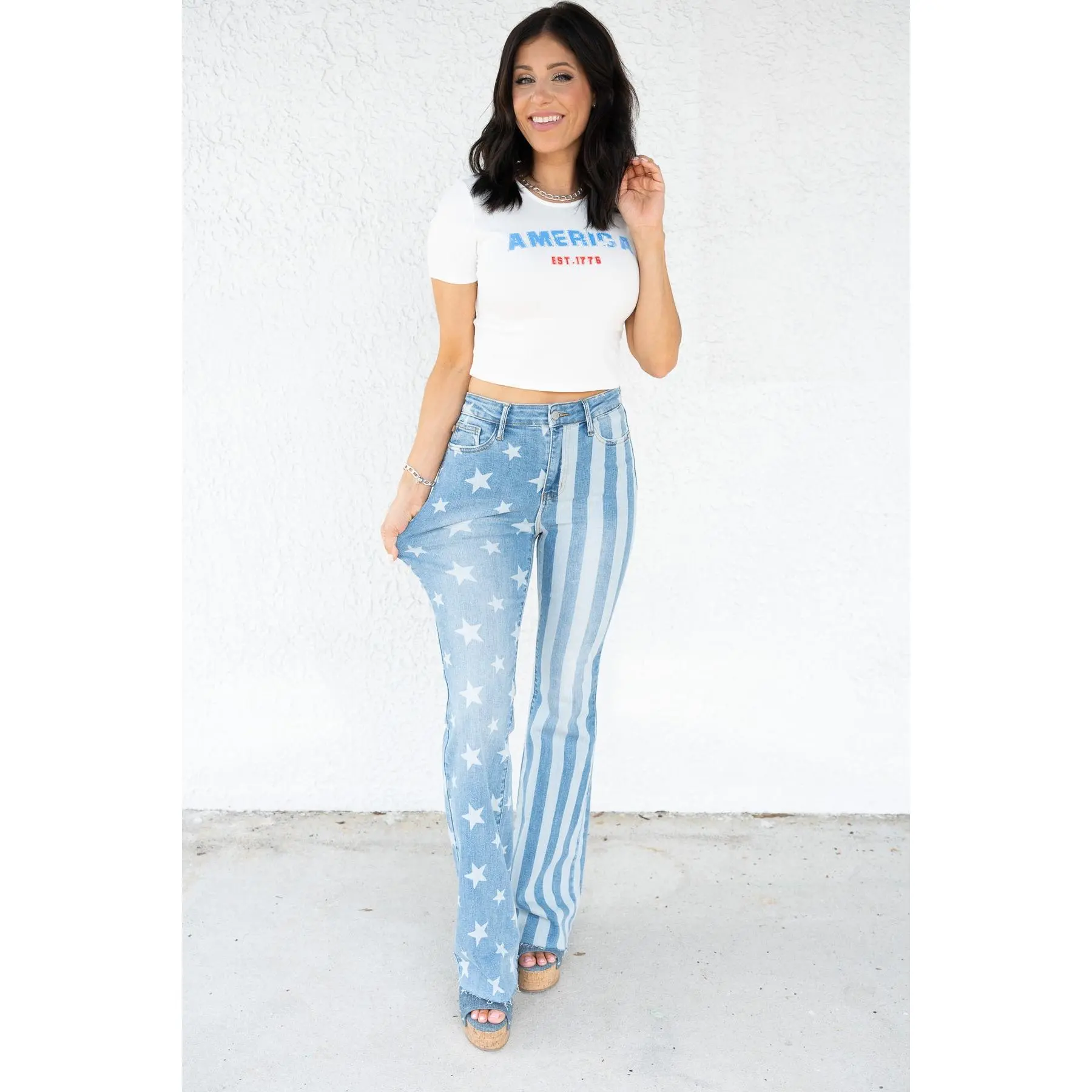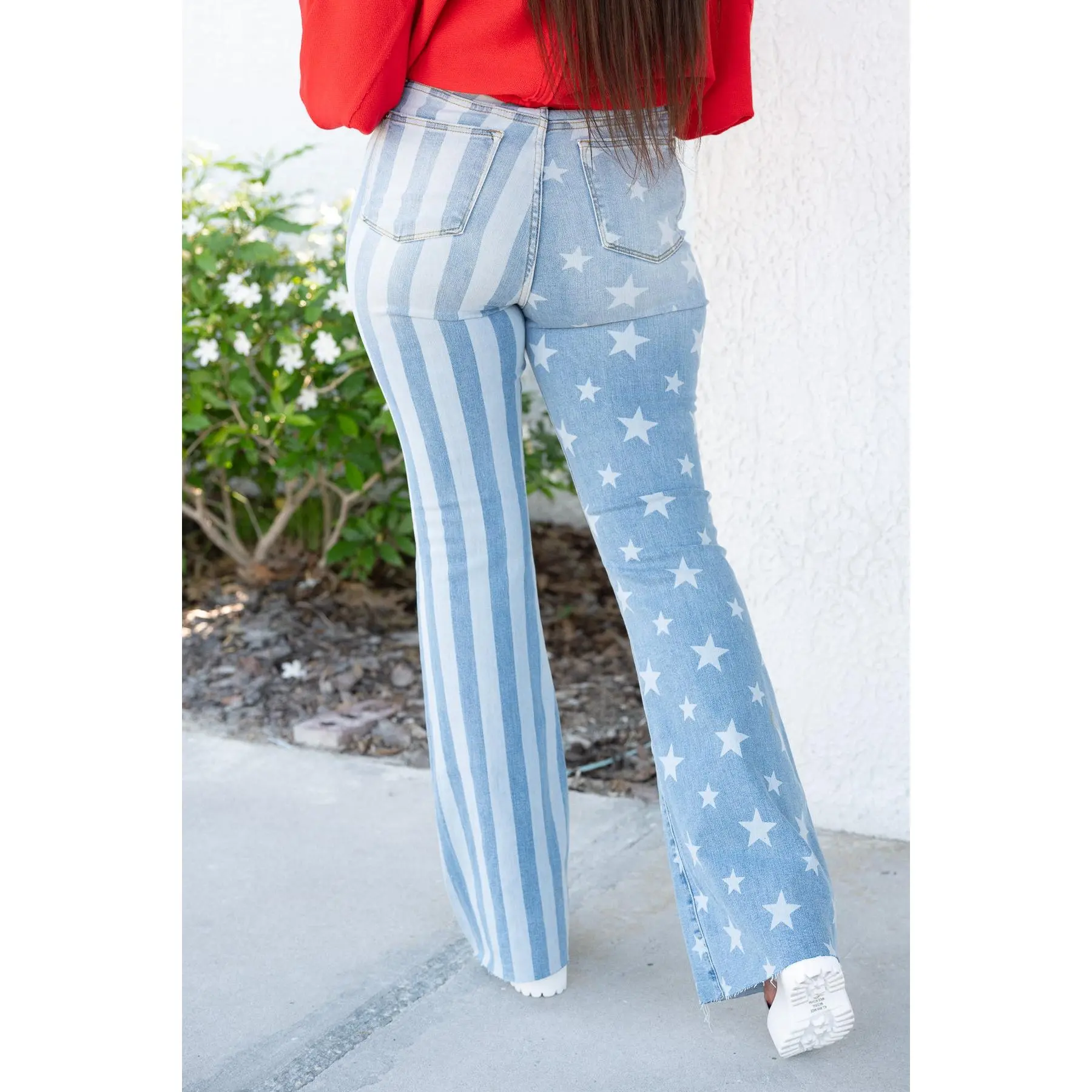 I bought these for July 4th thinking they are a one and done for the holiday. I’m extremely surprised in the great fit and quality. I am now looking to buy other jeans because I love the fit, stretch, flare and everything! Great quick shipping too.