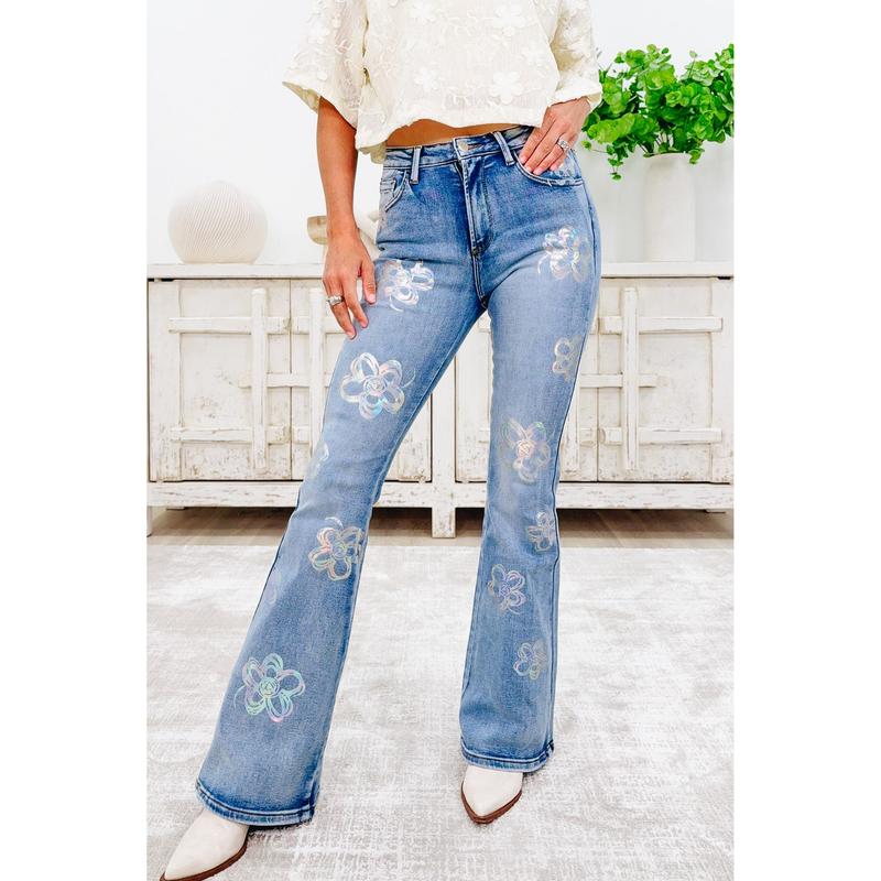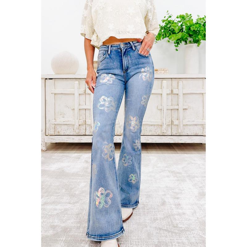 🚨 VIRAL ALERT 🚨 The Supernova Jeans are BACK! 🌸✨ Body-snatching flare + holographic flowers = legs for days. Perfect for every season + holiday ready 💃 Don’t wait, they sell out FAST! #SupernovaJeans  #FlareJeans #holographic #newjeans