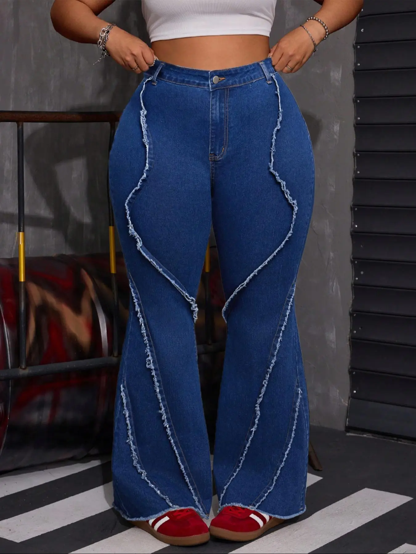 5. 【Plus Size】 Solid Color Flare Leg Denim Jeans, Fashion Casual Bell Bottom Trousers for Daily Outdoor Wear, Women Plus Clothing for All Seasons