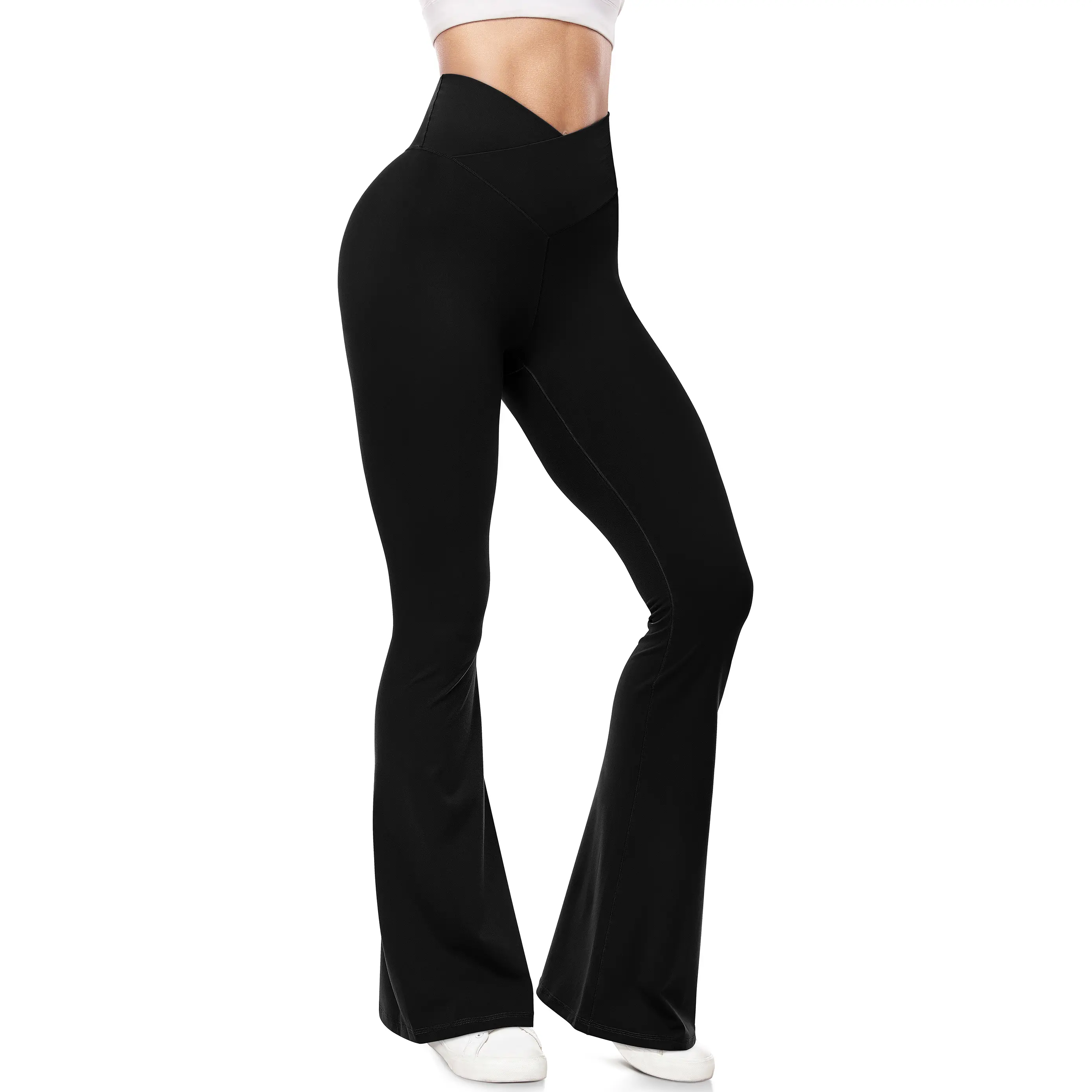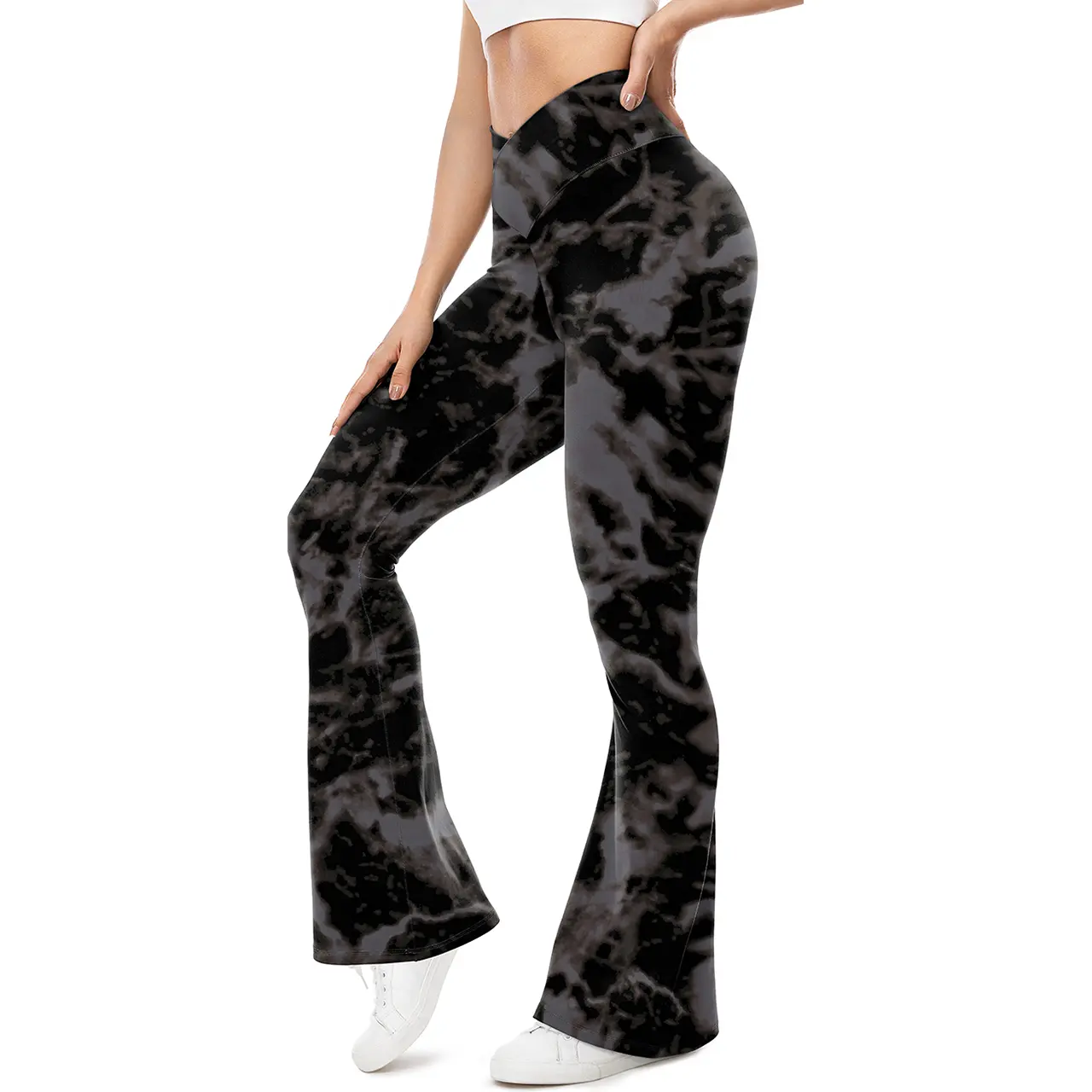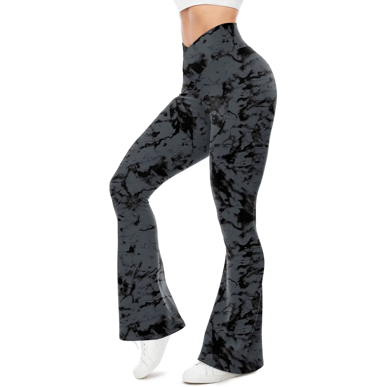 Flattering leggings with V crossover high waistband and flowy flare give an elegant look. Perfect for yoga, pilates, and beyond, providing all-day comfort.