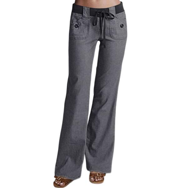 Stay comfortable in style with these Button Detail Drawstring Low Rise Flare Pants. Made from a blend of 97% cotton and 3% spandex, they are perfect for all seasons.