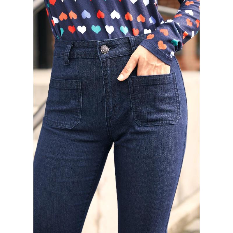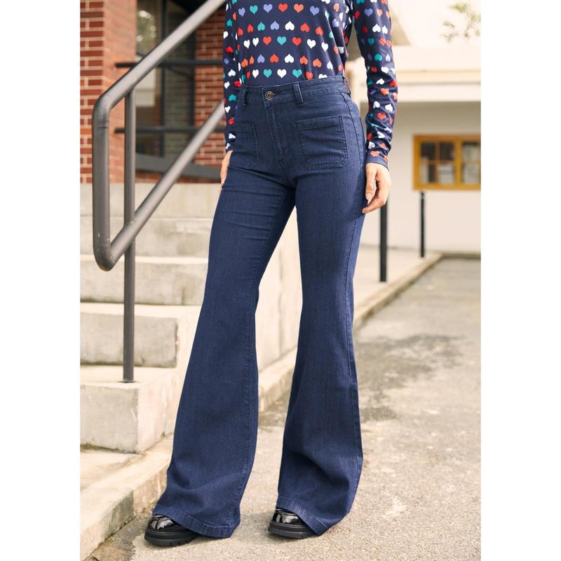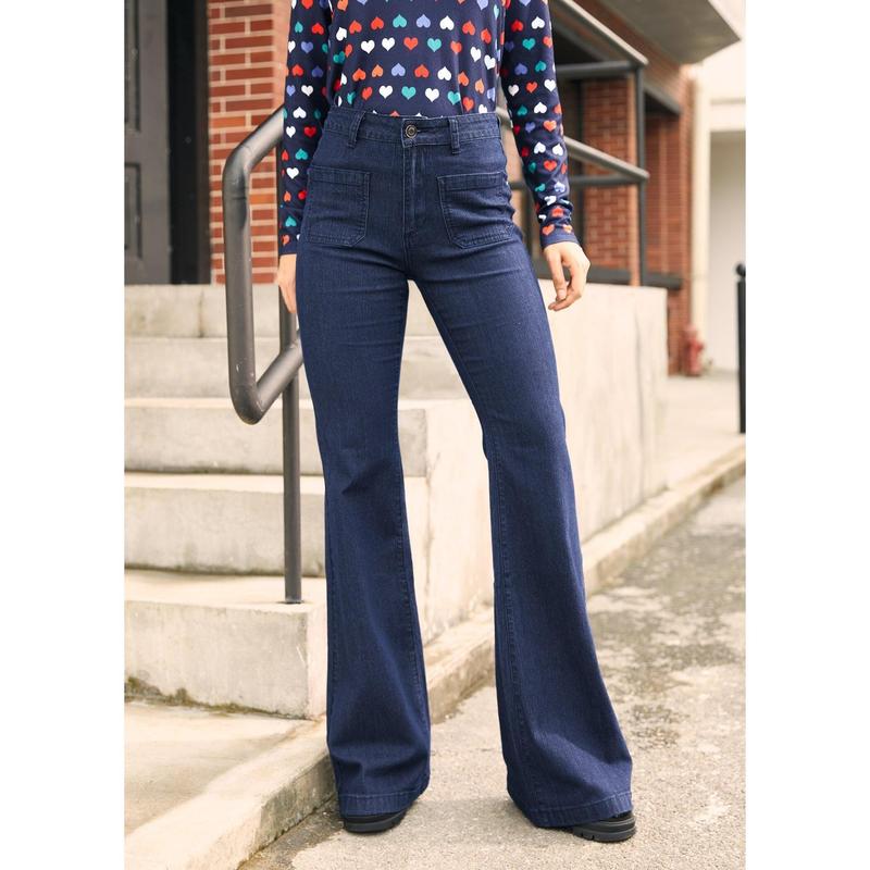 Their deep blue wash and nautical-inspired front and back patch pockets give these 1970s-inspired pants chic and elevated touches that will make them a staple in your closet.