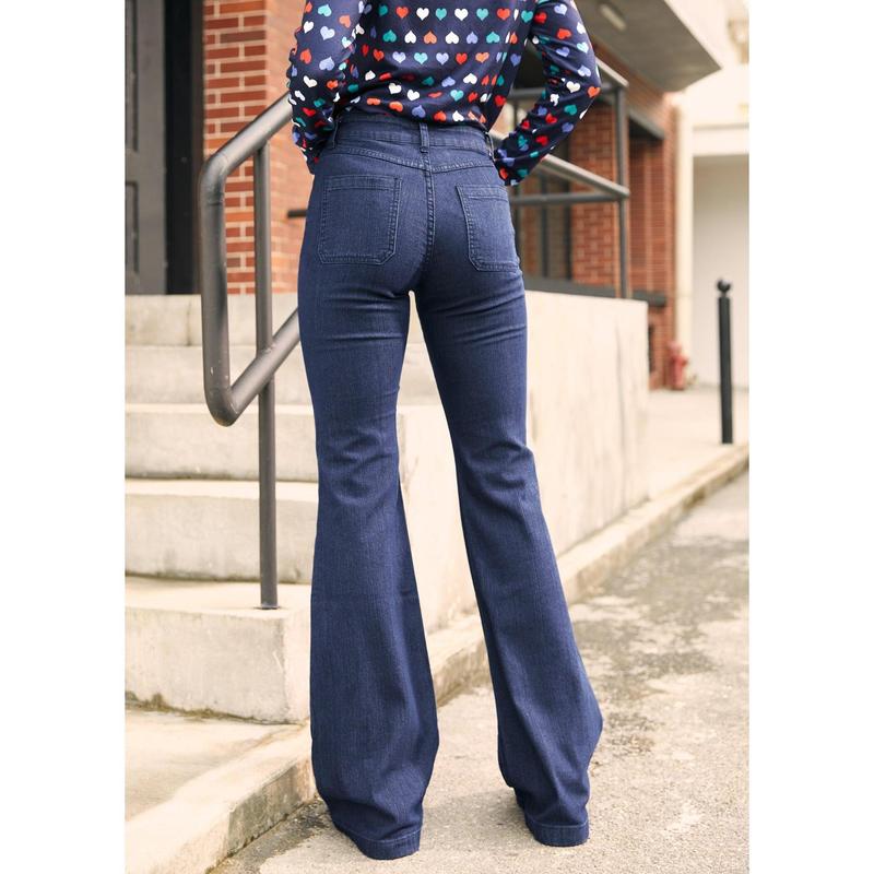 5. ModCloth Love and Mariner Flared Leg Jeans, 34" Inseam - Dark Wash (0-26W) Blue Stretch Denim