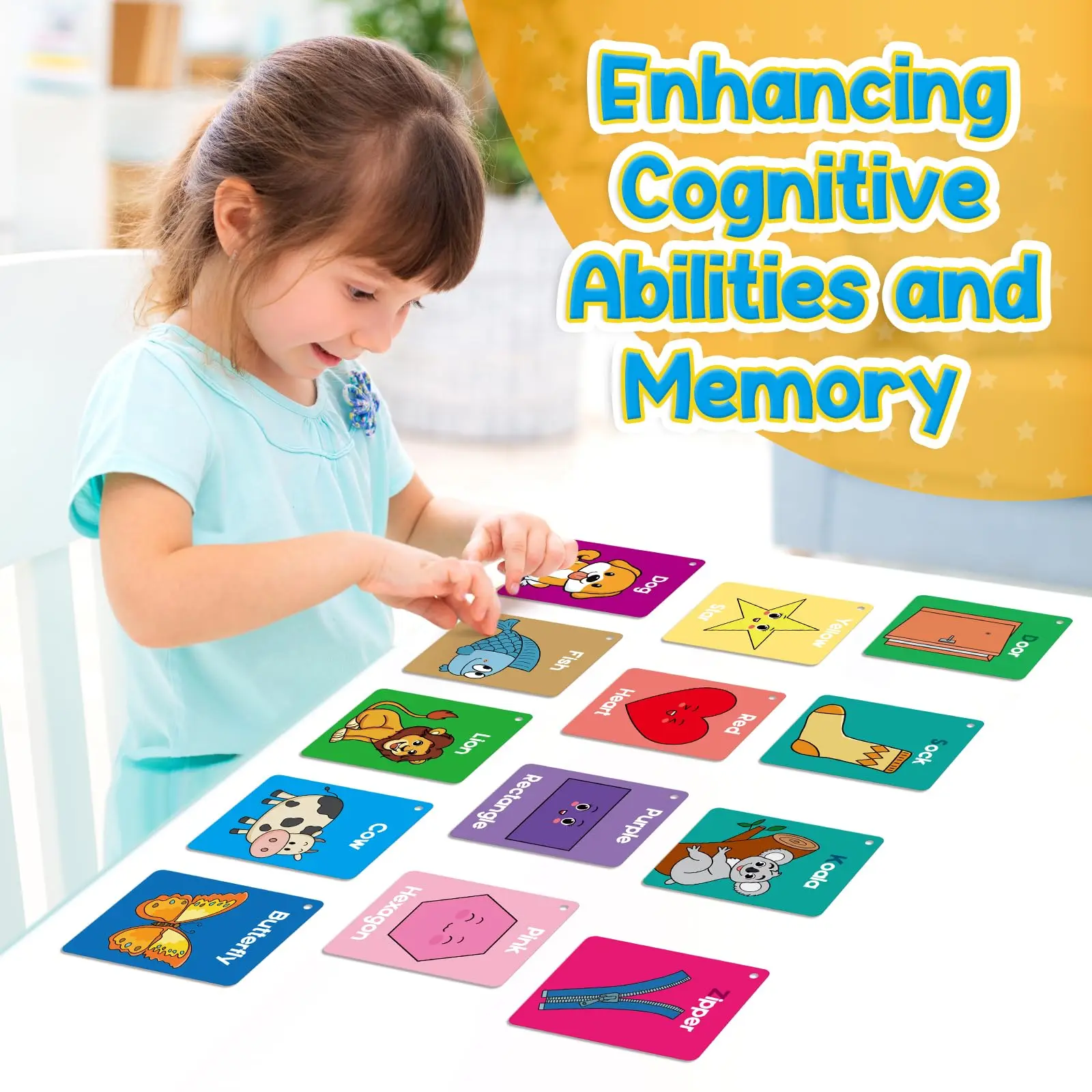 ·【What's Included】Include 60 double-sided flash cards, and 5 colored rings. Designed to teach young learners foundational skills, these cards cover the alphabet, counting from 1 to 10, shapes and colors, animals, first words, body parts, foods and fruits.