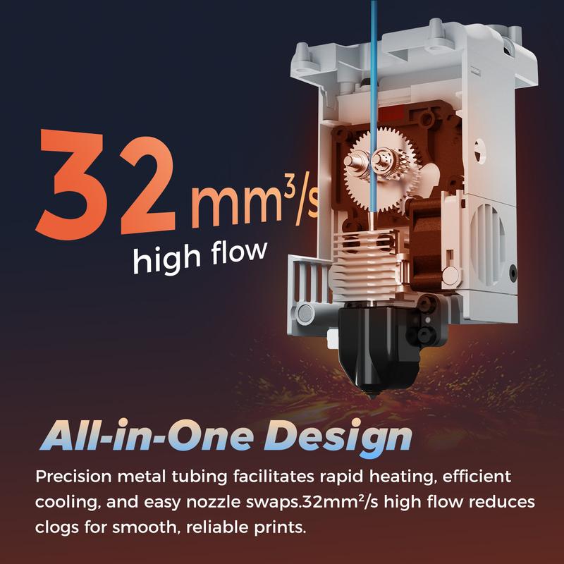 ·All-in-One Hotend Design: Integrated structure with a precision metal tube connecting heater block and heat sink. Provides faster heating, efficient cooling, stable extrusion, and easy nozzle replacement.
