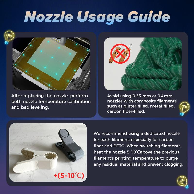 ·Usage Recommendation: After replacing the nozzle, perform temperature and bed leveling calibration. To reduce clogging, slightly raise the nozzle temperature above the previous filament when switching to clear any residue.