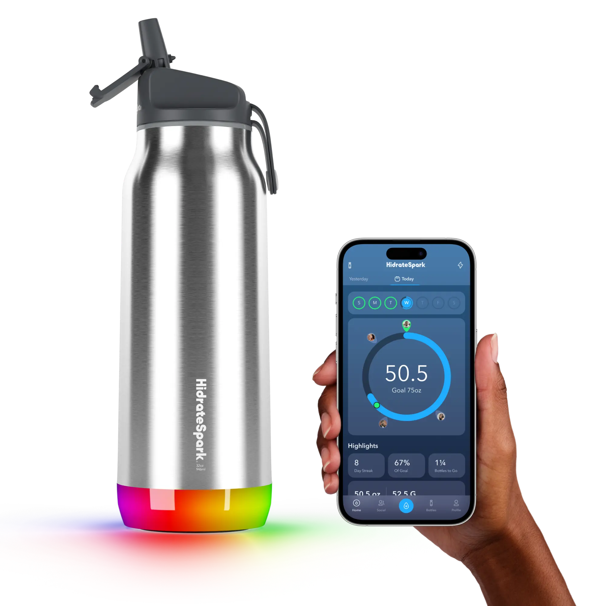 The finish on the bottle provides for a firm grip and the handle to carry it is sturdy. The reminders, light and sound, have helped me reach my hydration goals and i feel much less lethargic now. Tracking of the volume of water is very accurate in my opinion. The only thing i am disappointed with is that i have to pay for the āin appā extras to get some features that you need like the type of drink you drink. It offers a few free ones like water and coffee but not milk or juice (i expected at least those). Iām still happy with my purchase.