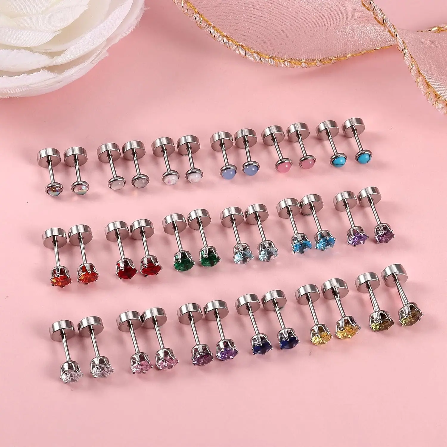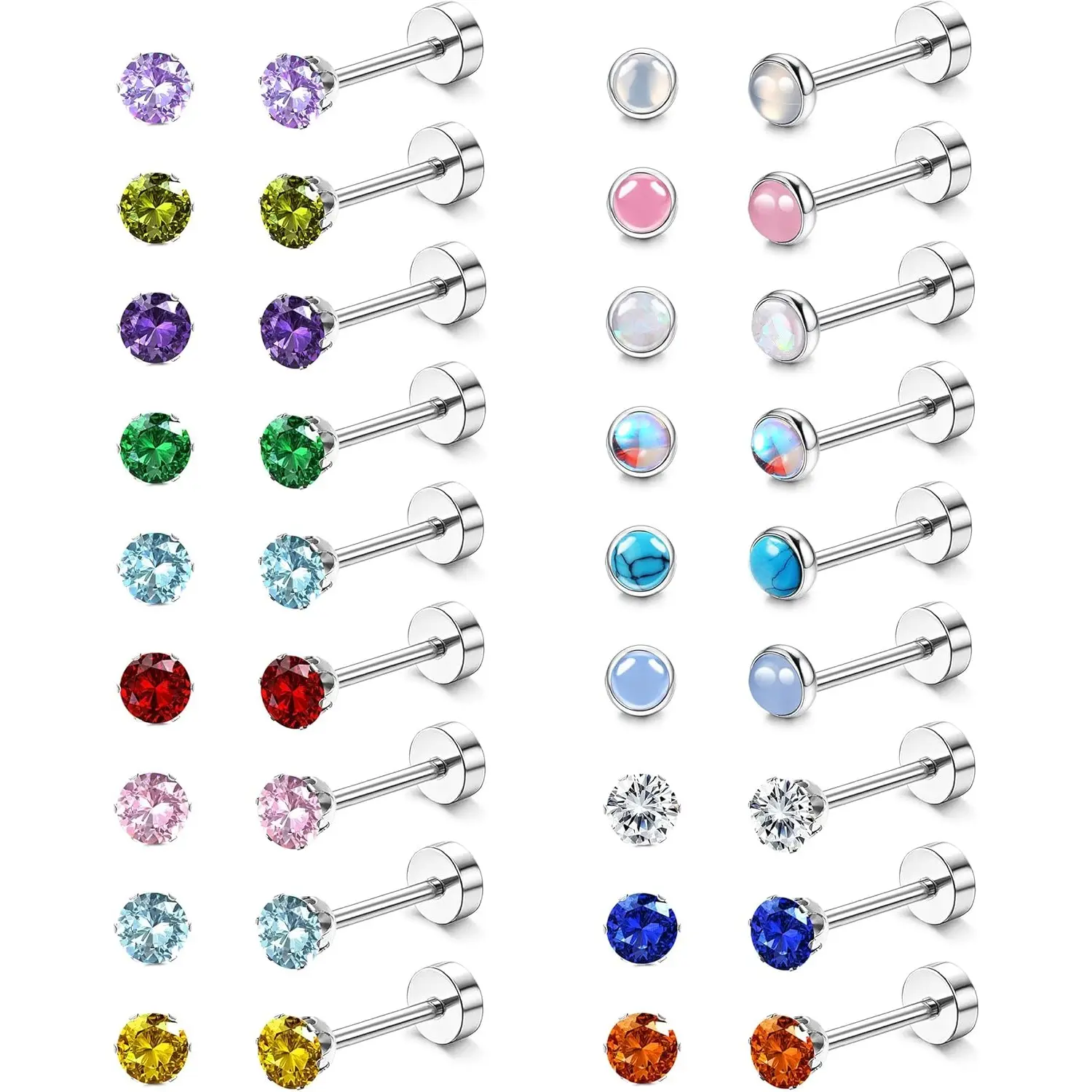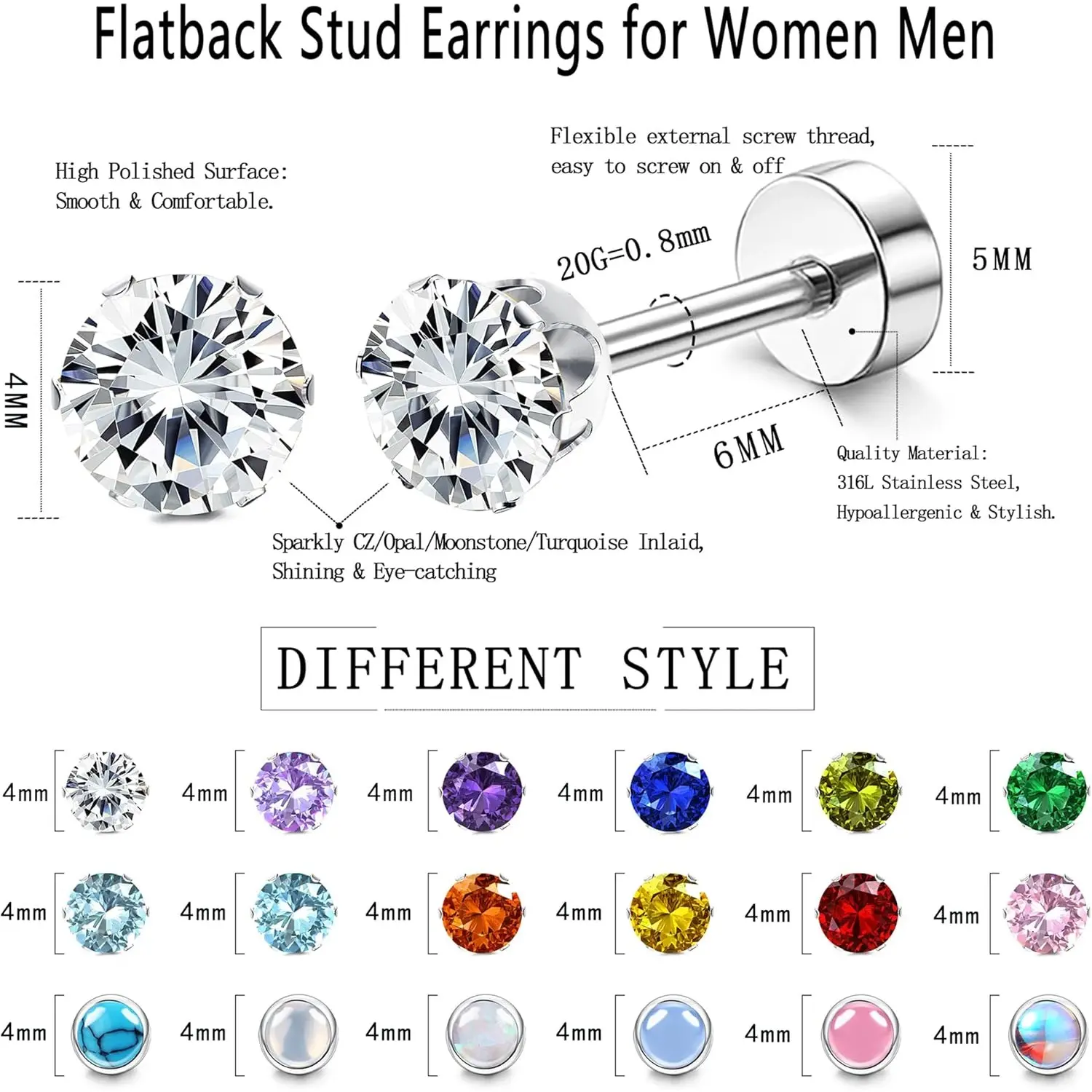 18 Pairs of Flat-Back Earrings:Get 18 pairs of stunning stainless steel CZ stud earrings in various colors and designs, including opal, cubic zirconia, moonstone, turquoise, and birthstone earrings, offering you more daily wear options. AAAAA-grade zirconia diamonds add elegance, perfectly complementing any outfit!