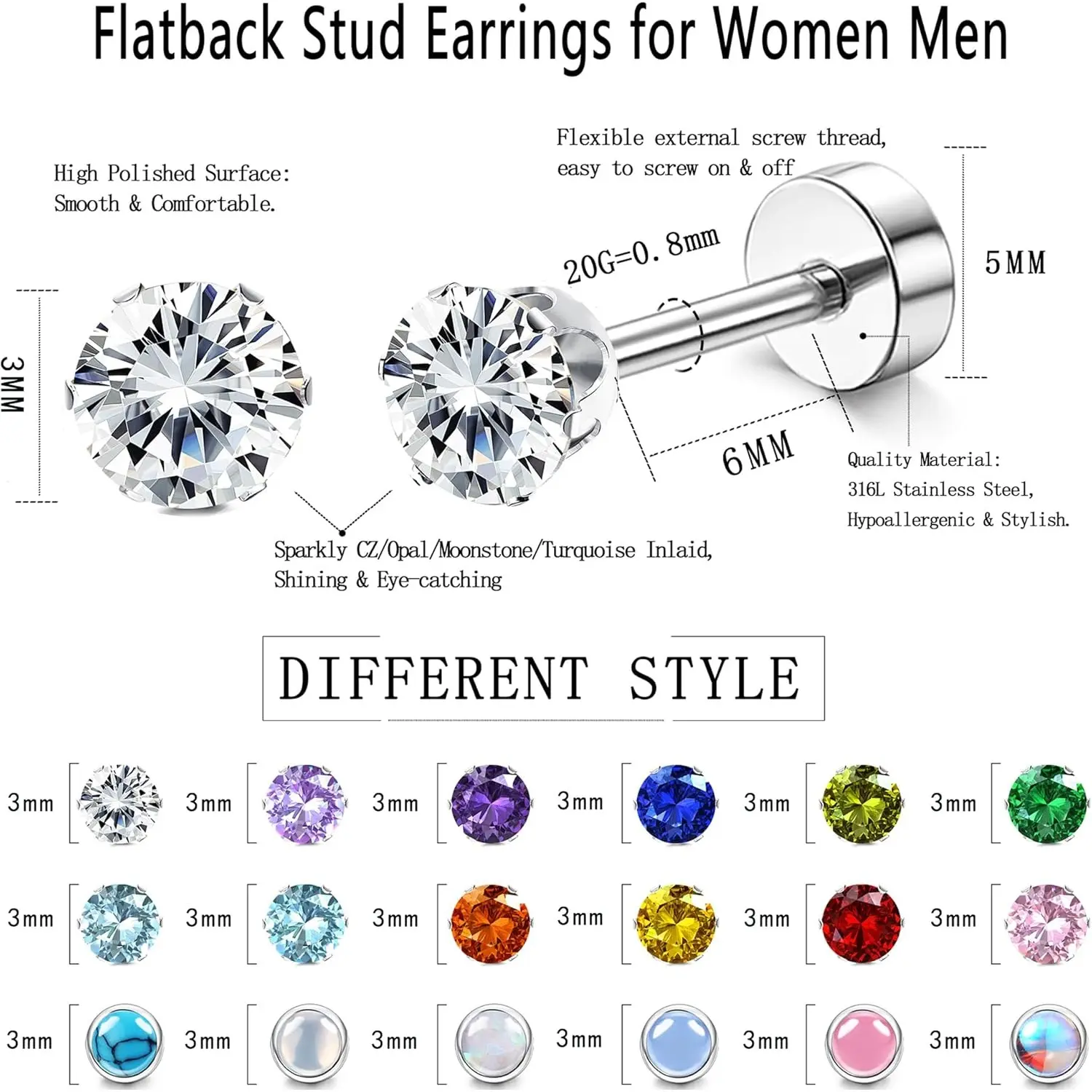 Hypoallergenic Earrings for Sensitive Ears:Our adorable screw-back stainless steel earrings are made of 316L surgical steel, hypoallergenic, lead-free, and nickel-free, safe for sensitive ears. They won’t rust or turn ears green and are easy to put on and take off. Available in three sizes—3mm, 4mm, and 5mm studs—small and lightweight for comfortable wear without worry!