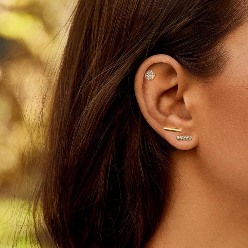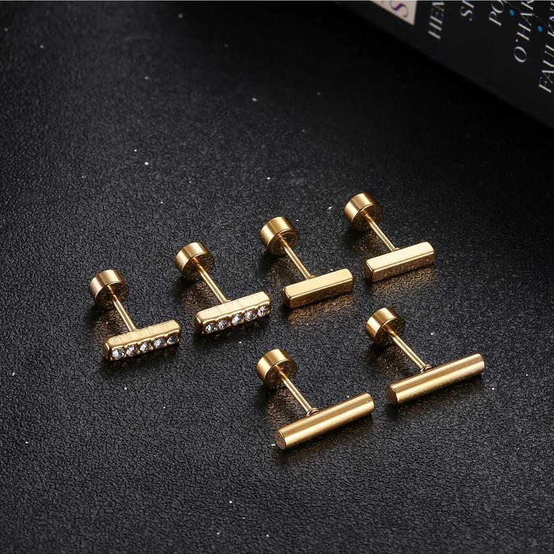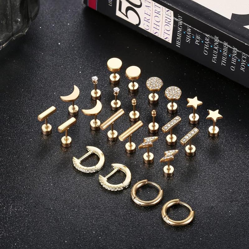 CLASSIC STYLE: One order includes 10 pairs flat back gold stud earrings, moon and star earrings; bar earrings; dot earrings; lightning bolt earrings; cz and ball earrings, and 2 small gold hoop earrings.