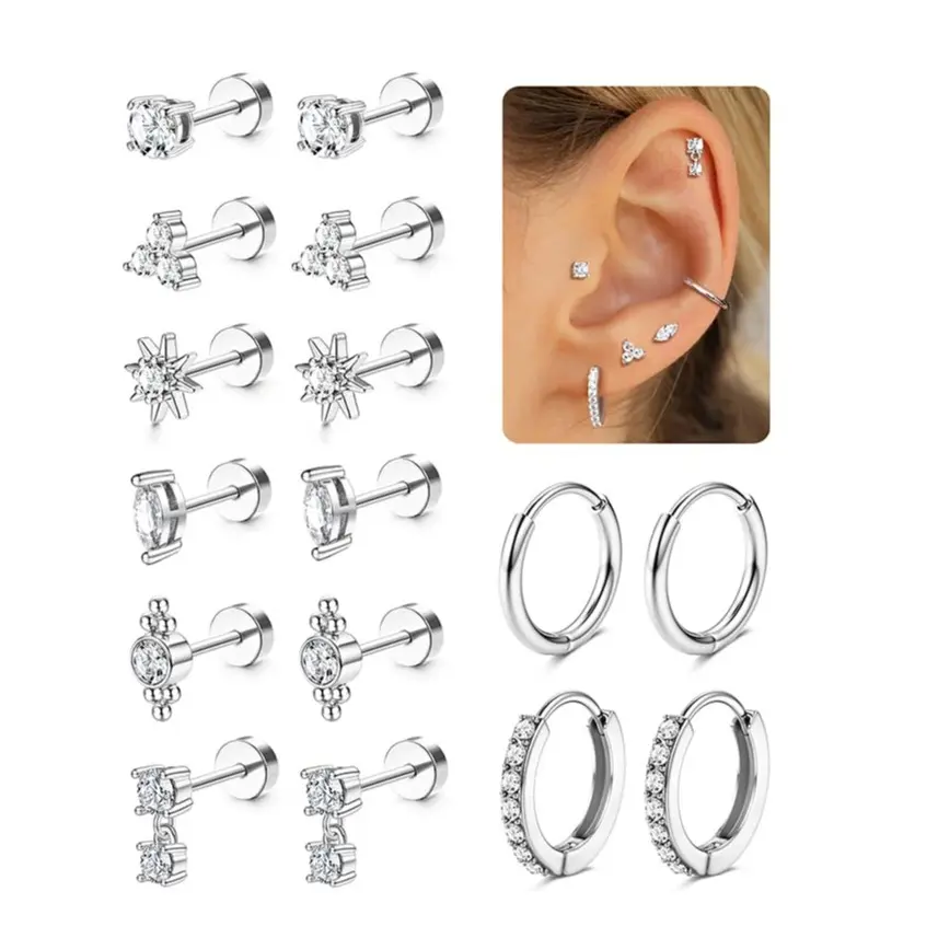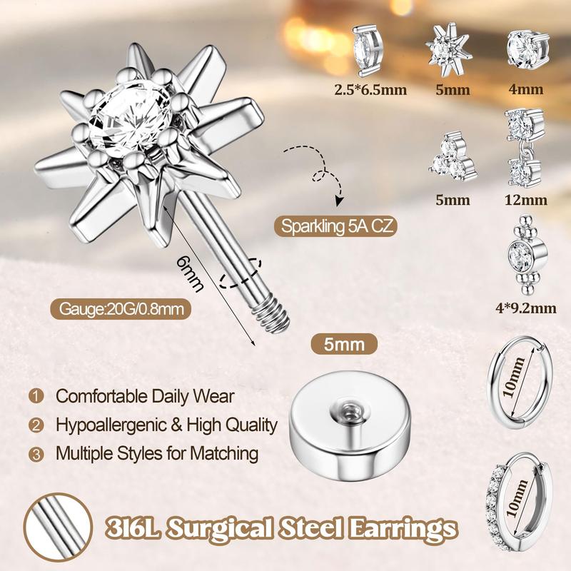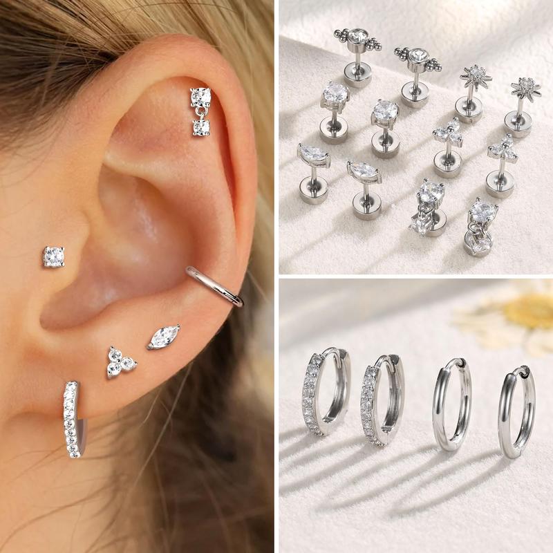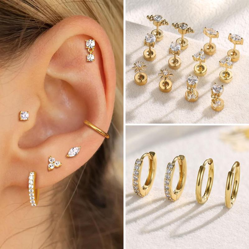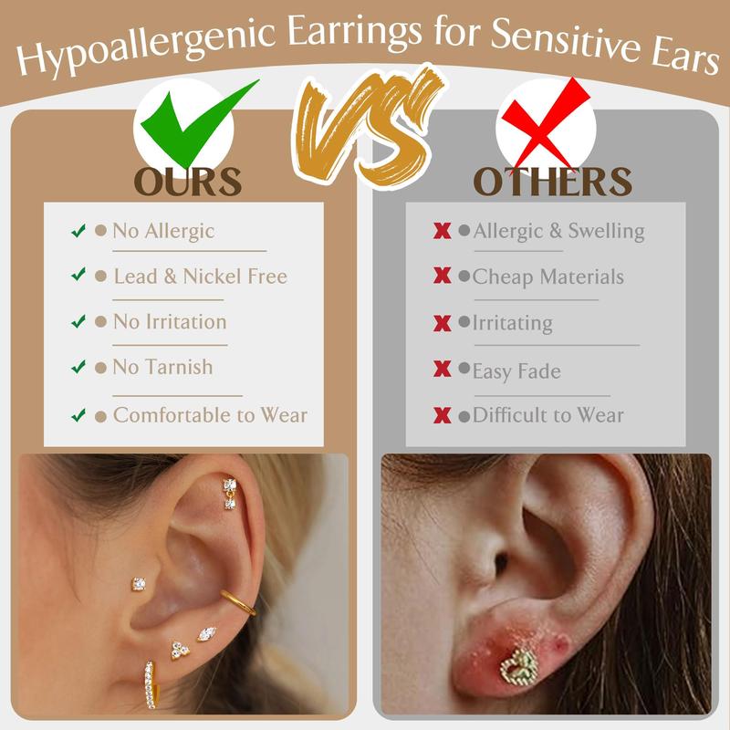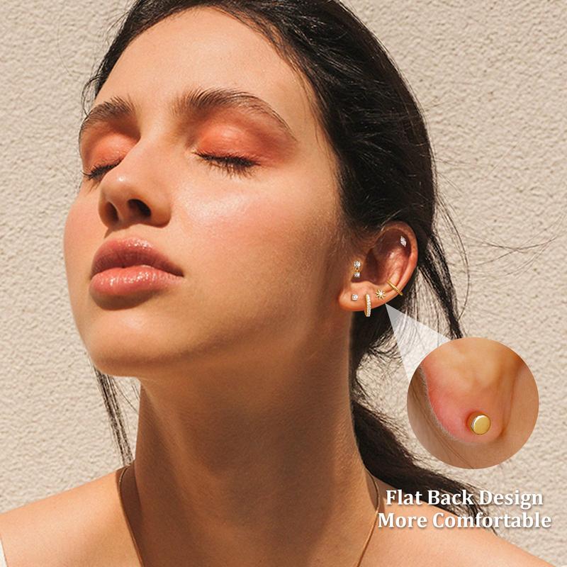 ·【Earring Sets for Multiple Piercing】This set includes 6 pairs of flat back earrings and 2 pairs of huggie hoop earrings. These hypoallergenic earrings are stylish and elegant, suitable for various piercings and perfect for both single and stacked wear. Ideal for cartilage, helix, first, second, third lobes, tragus, and daith piercings. Mix and match to suit your style!