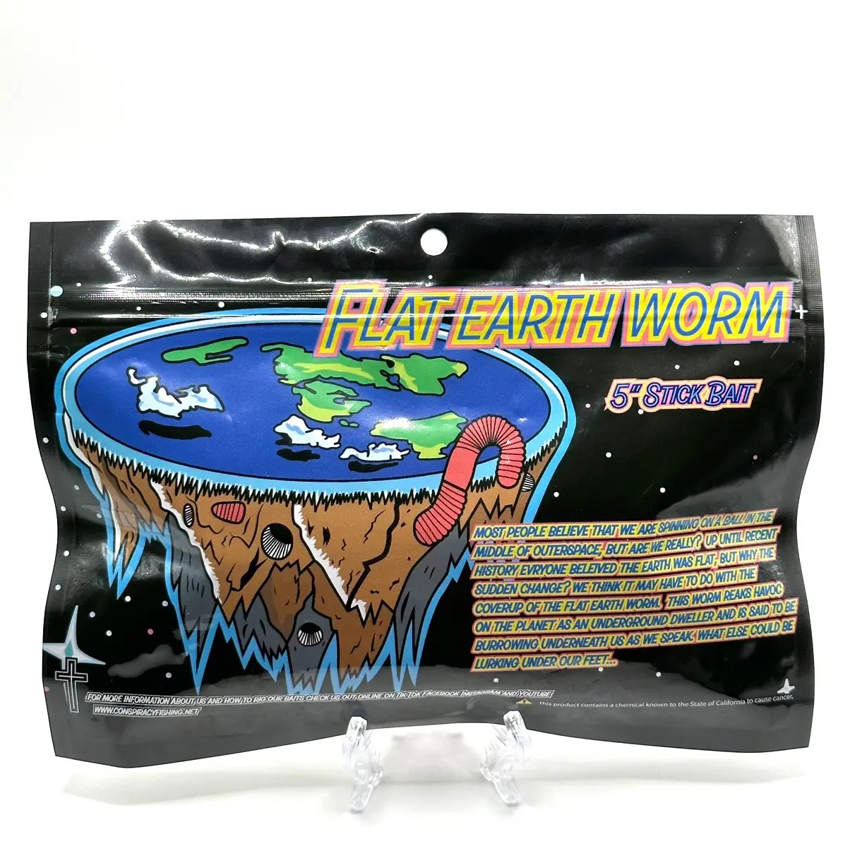 The Conspiracy Fishing Flat Earth Worm Stick Bait has a length of 5", making it perfect for spinning or baitcasting fishing types. Add this top-notch lure to your tackle box now and be ready to impress with your catch!