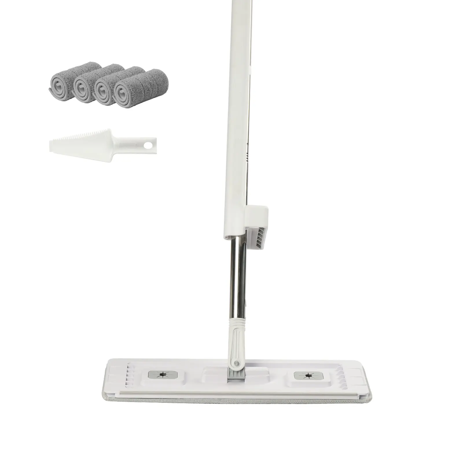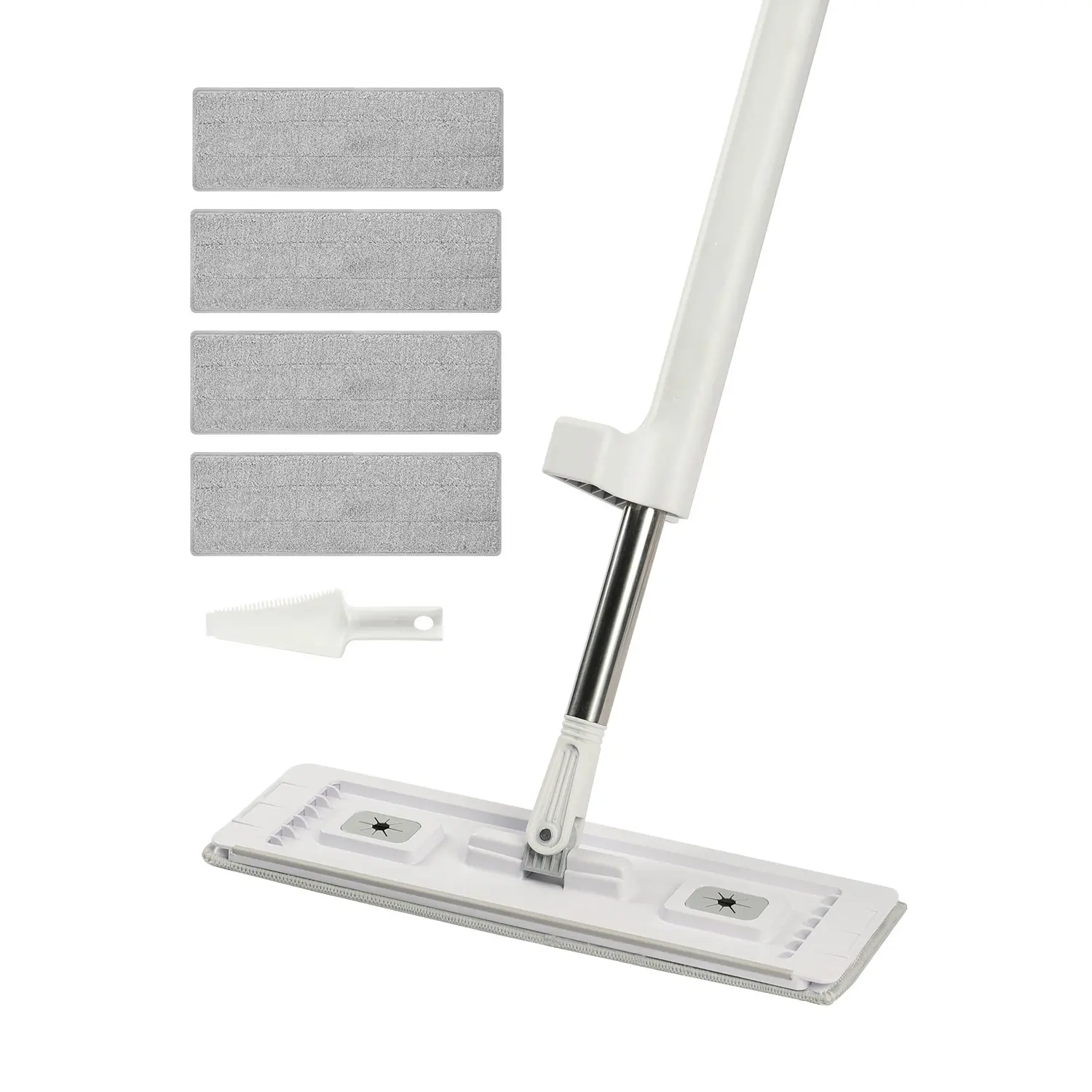 • Hands-Free Mop: With our flat mop, there's no need to manually wash the mop pad. You just need to simply push and pull, and the built-in double spring scraper will remove hair, dust, and dirty water, keeping your hands clean and hygienic.