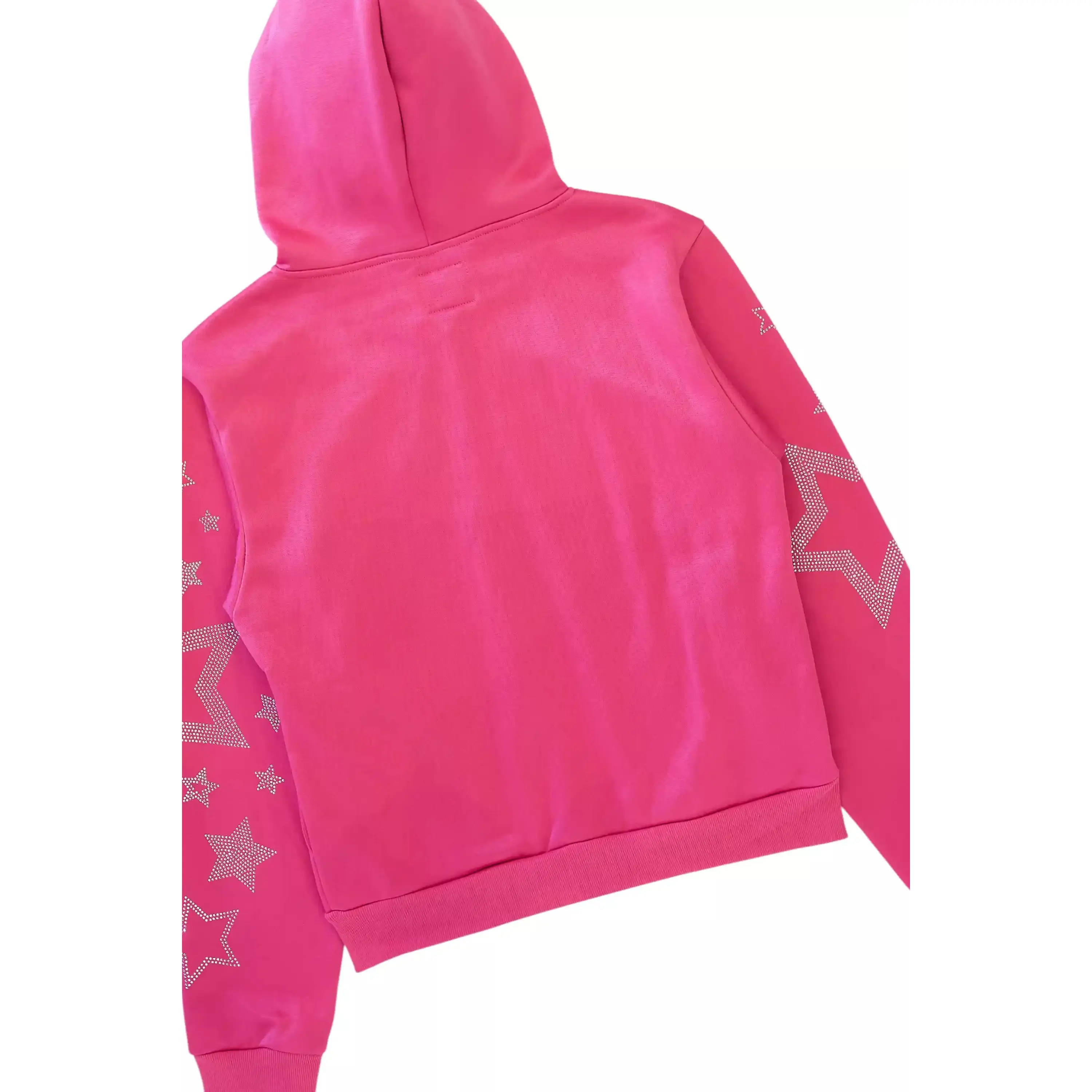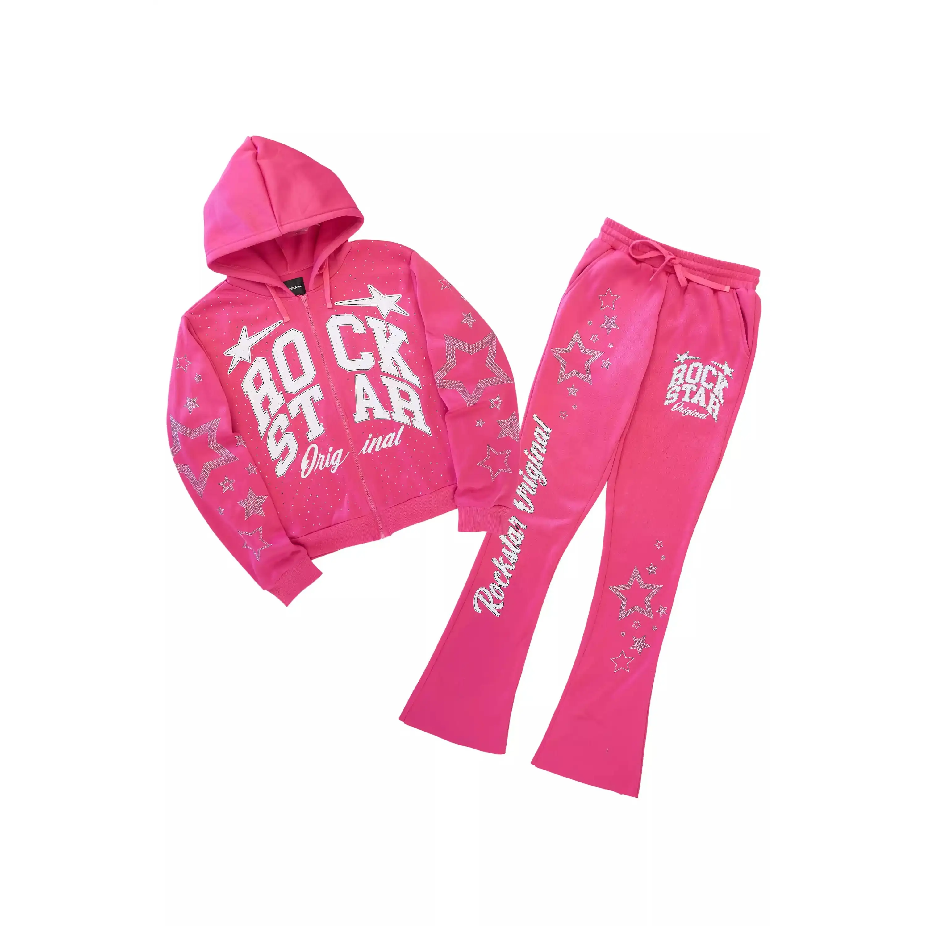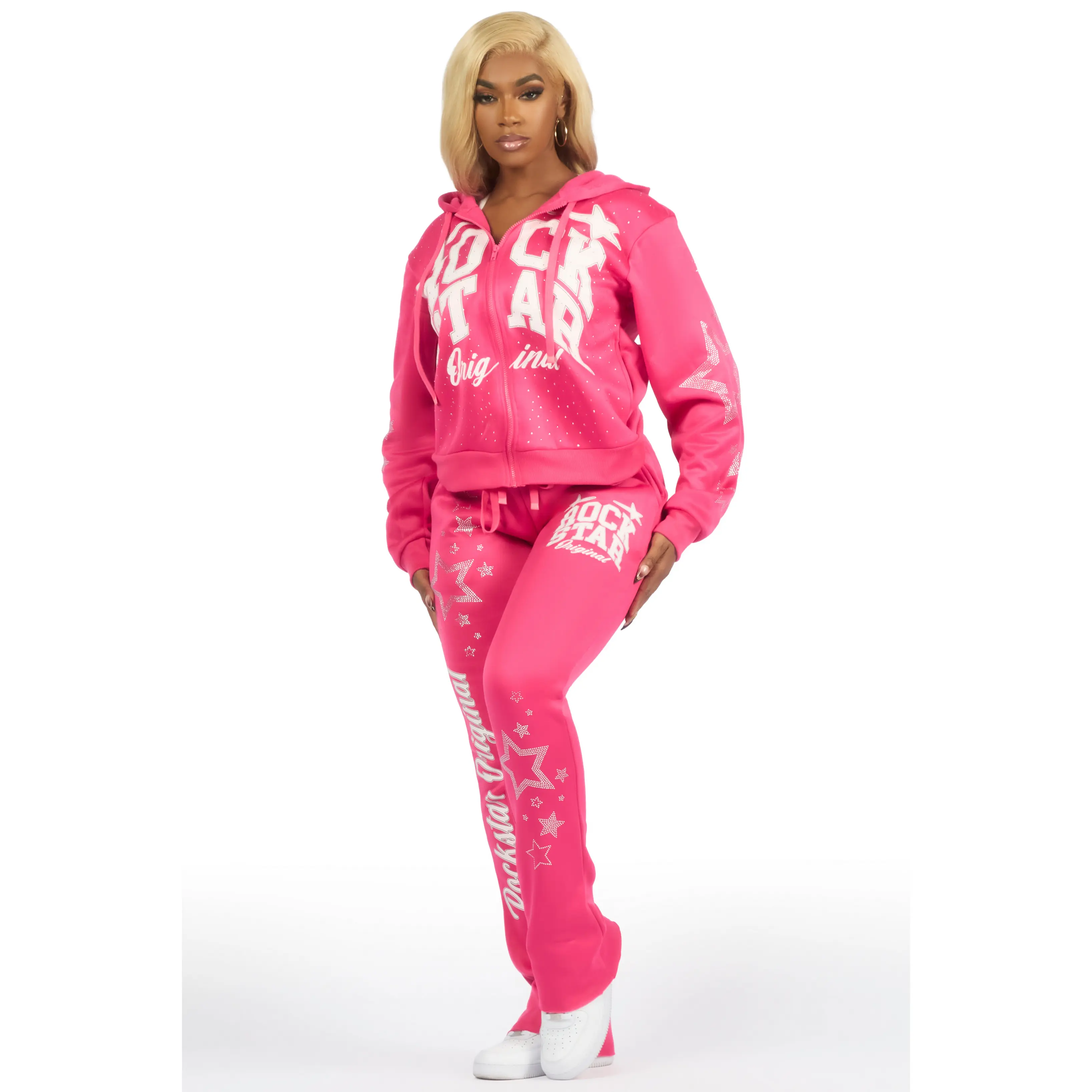 An urban two-piece hoodie and stack track pant set for women in hot pink. Designed with extra long legs and custom detailing for a gorgeous streetwear essential.
