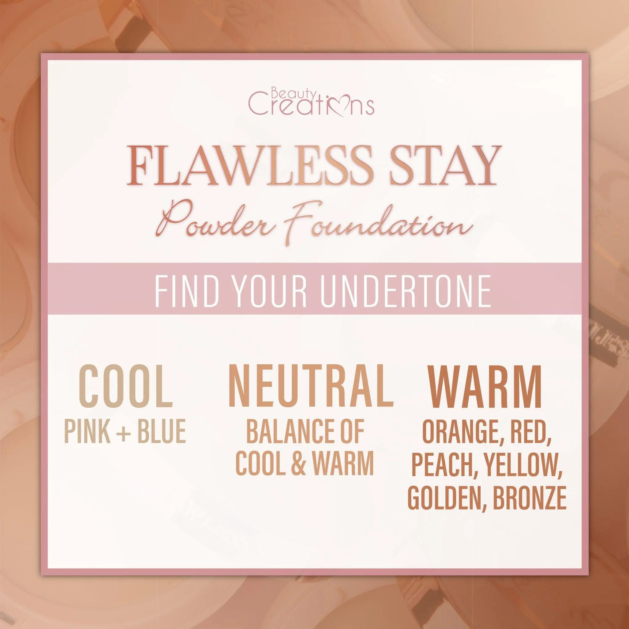 I am so impressed with Beauty Creations Flawless Stay Powder Foundation! First of all,it arrived faster than expected. I could not believe how much effort they put into the pretty pink packaging-pink bubble wrap ensured that the product arrived intact. And it came with the samples I requested and cute stickers too! The compact opens to an extra lid that holds a powder puff-keeps it from sitting in the powder getting it germy. This is a fabulous idea! Now the product-wow,I'm in my 50's and usually use a heavy liquid foundation but no more. This powder foundation covers up blemishes without looking cakey and doesn't settle into my fine lines and crows feet. The color is a perfect match and it lasts all day. It is so quick and easy to apply-I love it! And finally,the price is so reasonable that I can get a bunch of makeup for the cost of my usual foundation. Love this company!