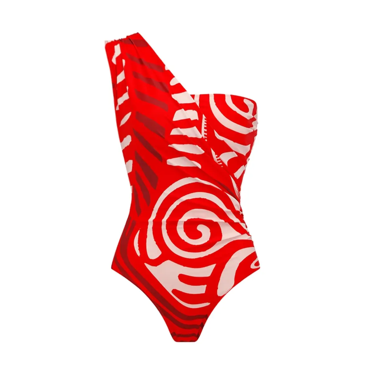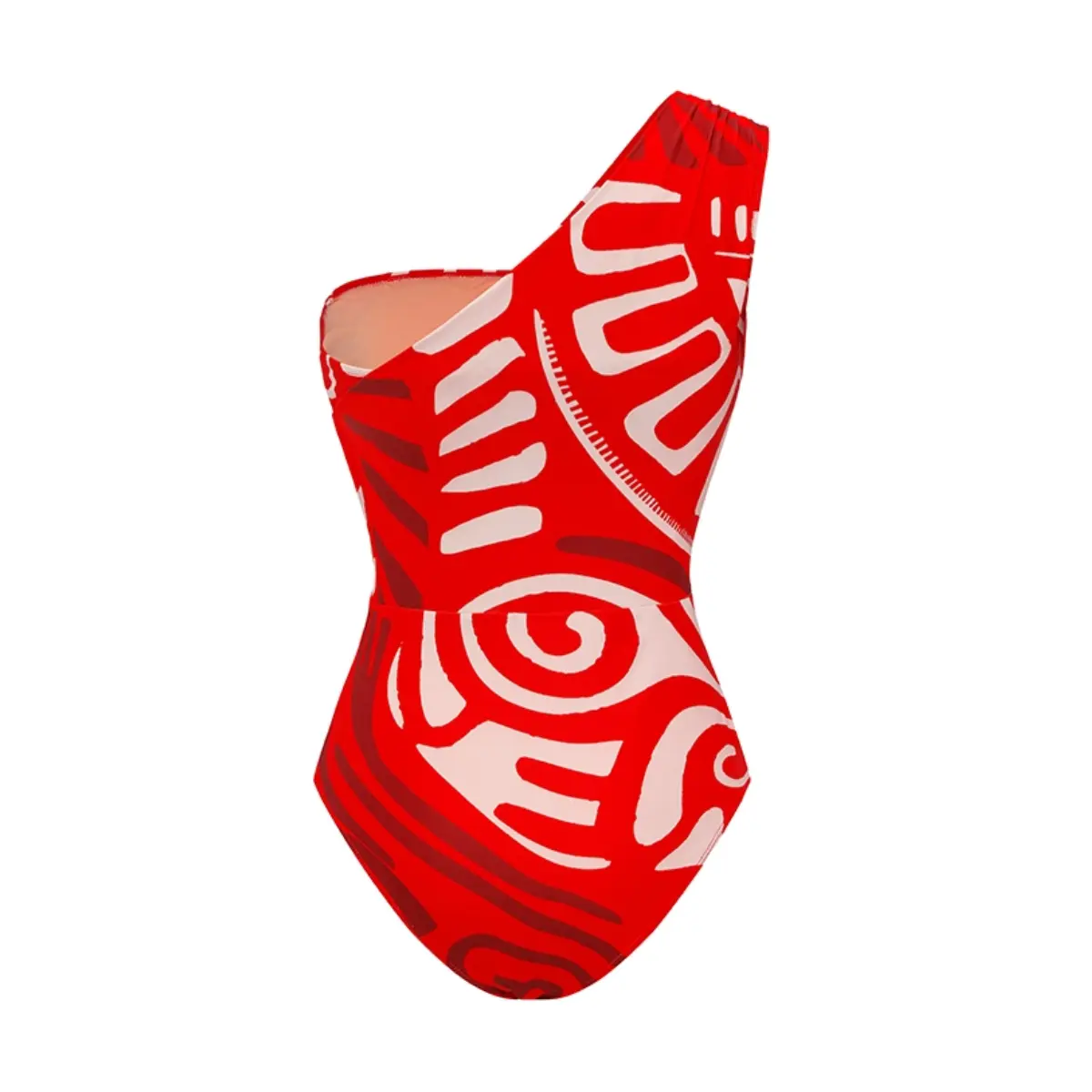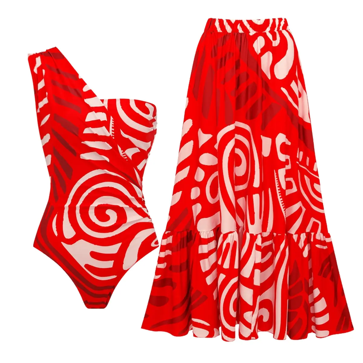 FLAXMAKER Women's One Shoulder Red Retro Print One Piece Swimsuit and Matching Cover Skirt Set Swimdress Stylish Beachwear Bathing Suit