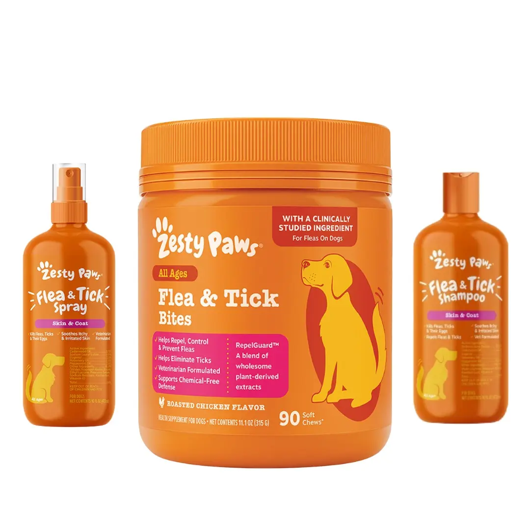 🐾 Eliminate Pesky Bugs! Zesty Paws Flea & Tick Spray effectively eliminates fleas, ticks, and their eggs. Perfect for playtime, snuggle time, or nap time, this spray ensures your pup's Zesty day. With vet-formulated ingredients, it's a reliable solution for your canine companion.