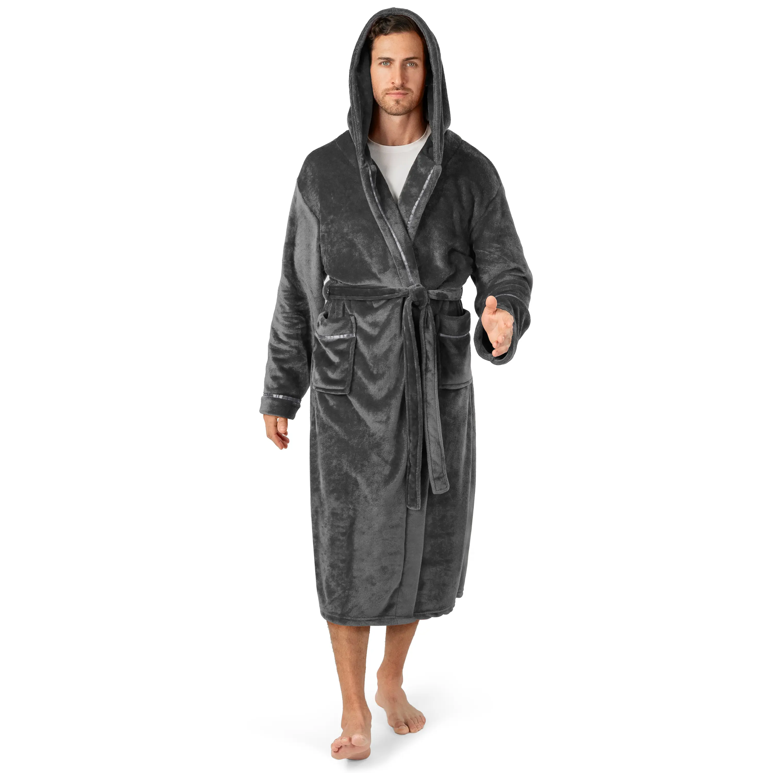 Our Premium Plush Men's Fleece Bathrobe is soft on your skin, lightweight, and keeps you warm. We accent the robe with satin trim design to give it an extra luxury feel!