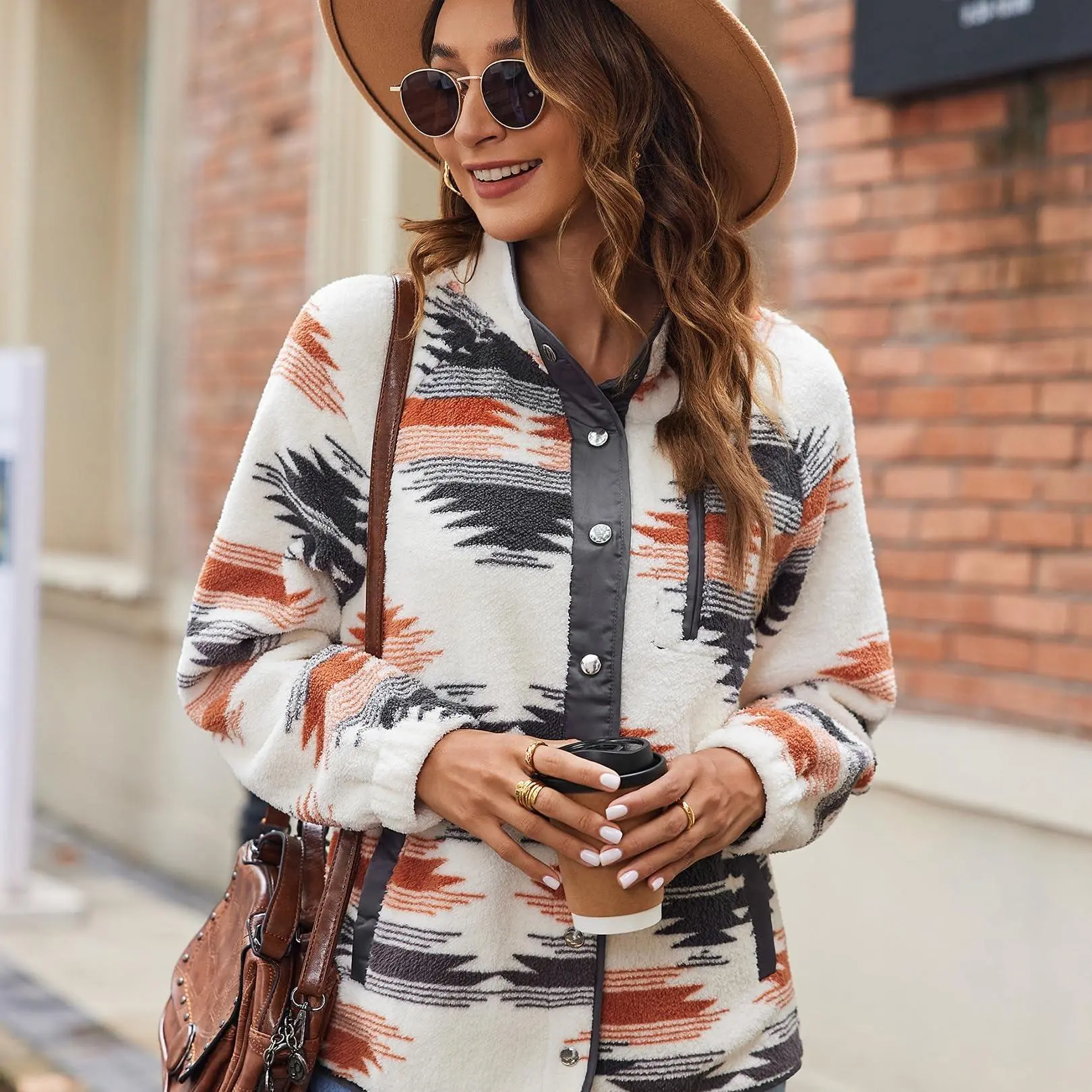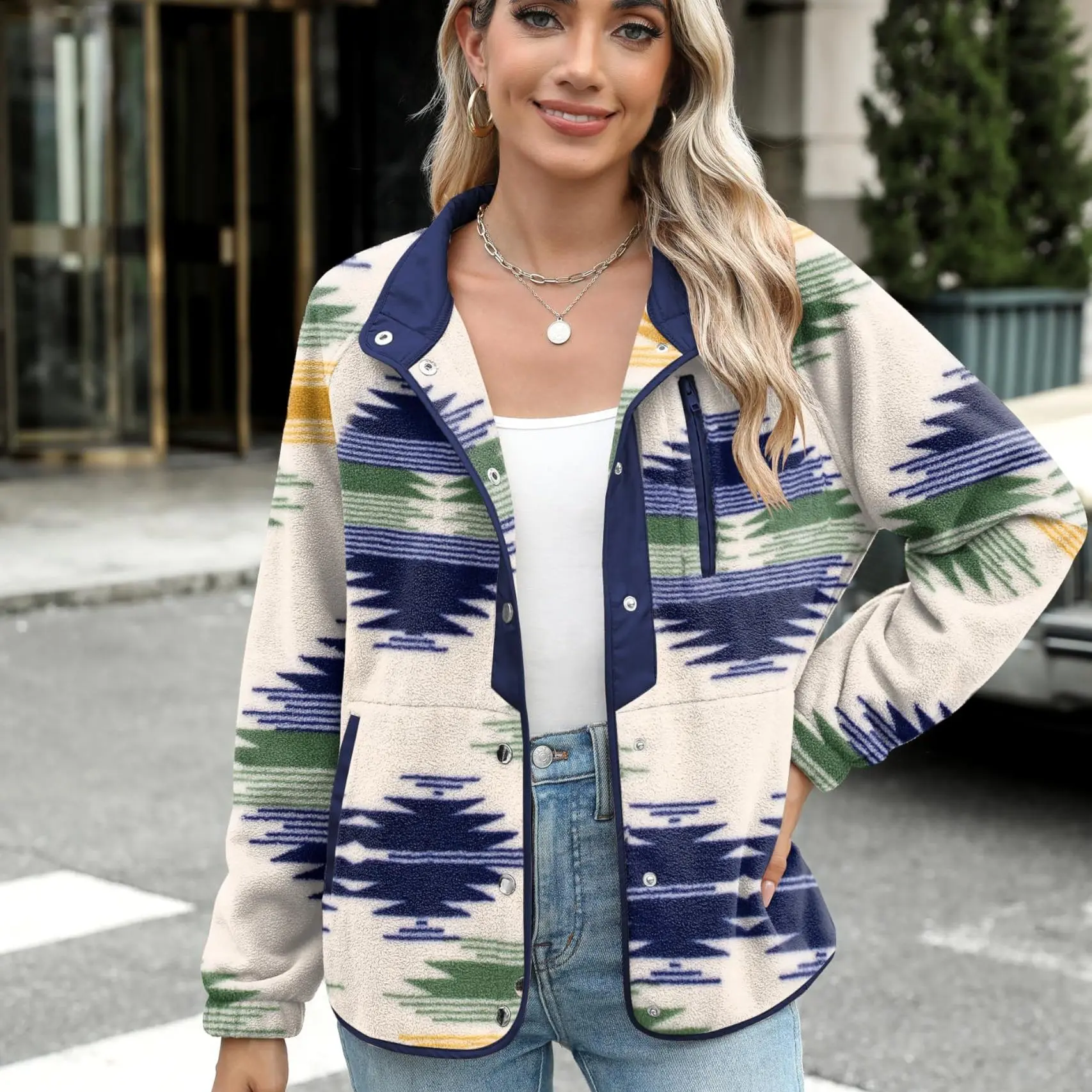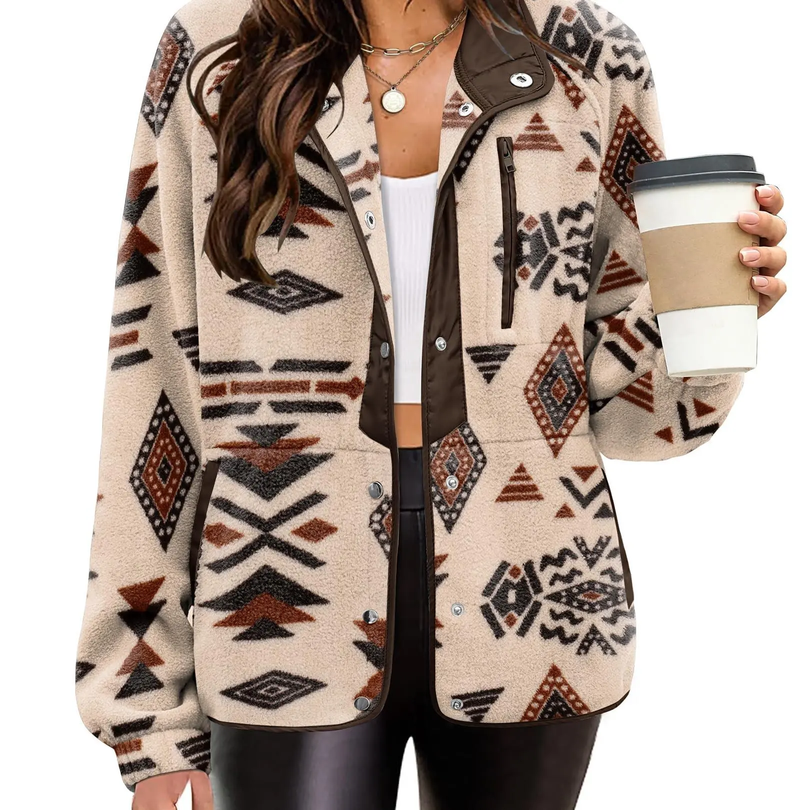 ·Features: Women's snap-button jacket, cozy fleece jackets, sherpa coat, Western Aztec Print, stand collar, long sleeves, 1 zip pocket on chest, 2 side hand pockets. A great jacket for autumn and winter