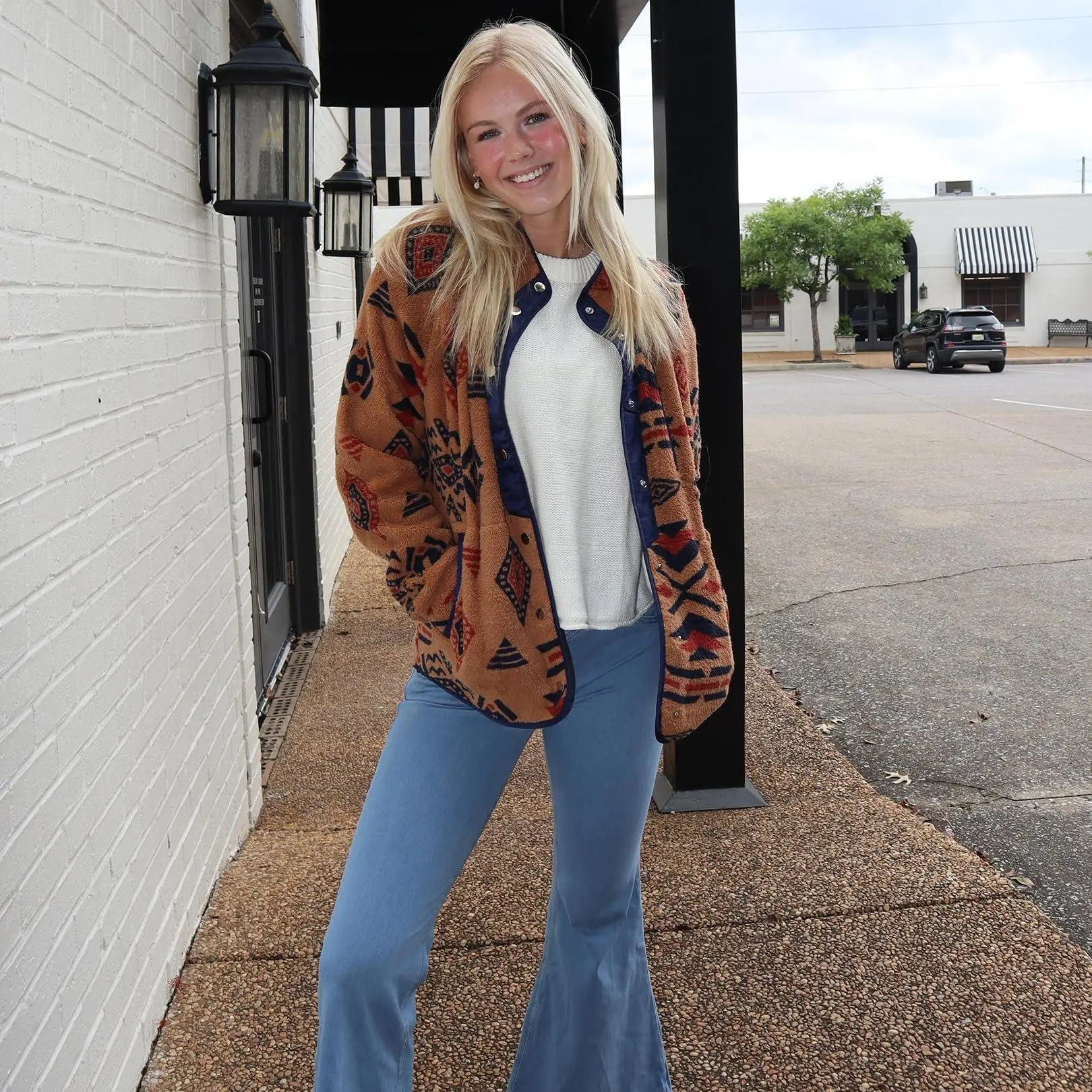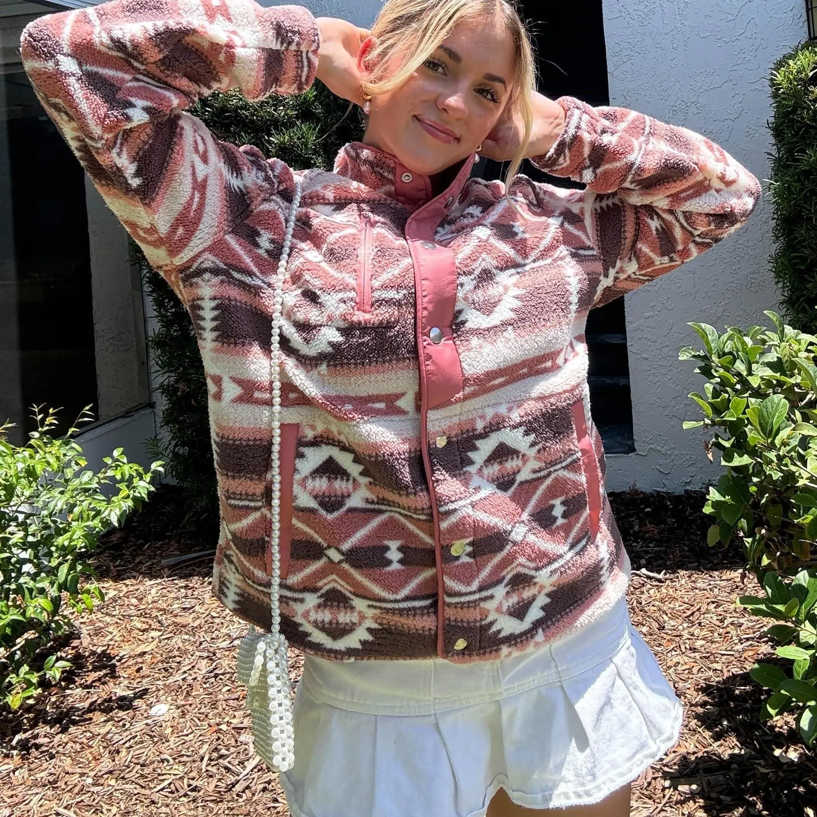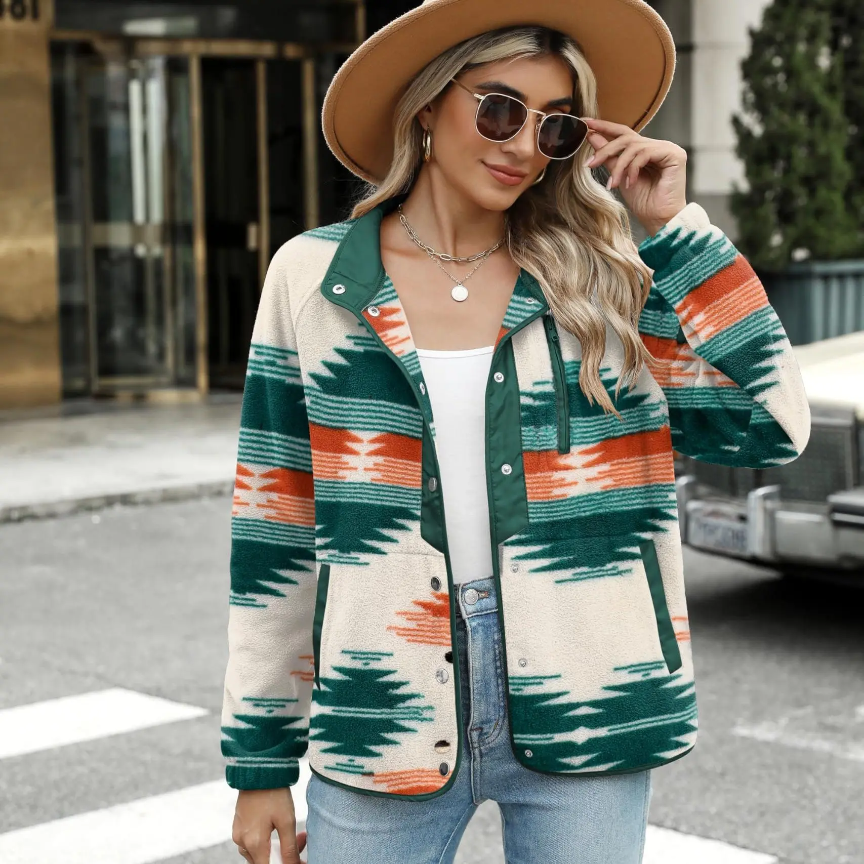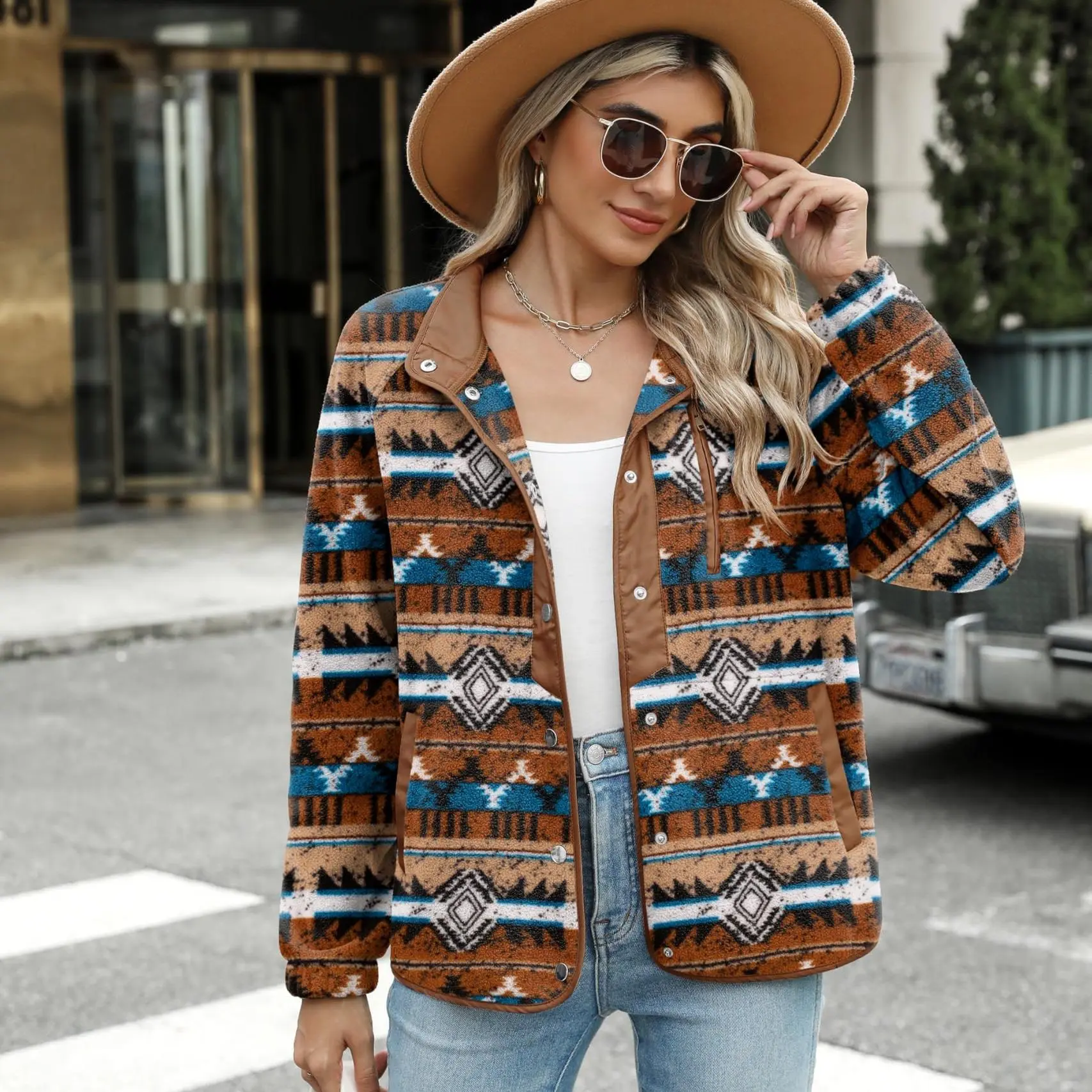 ·Features: Women's snap-button jacket, cozy fleece jackets, sherpa coat, Western Aztec Print, stand collar, long sleeves, 1 zip pocket on chest, 2 side hand pockets. A great jacket for autumn and winter