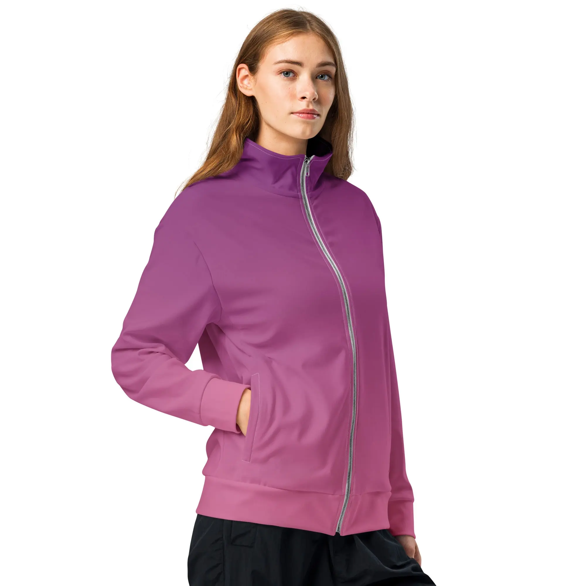 Stay warm and trendy with this zip-up track jacket—perfect for workouts, outdoor activities, and everyday wear. It’s made from recycled materials, has brushed fleece inside for warmth, and zippered pockets.