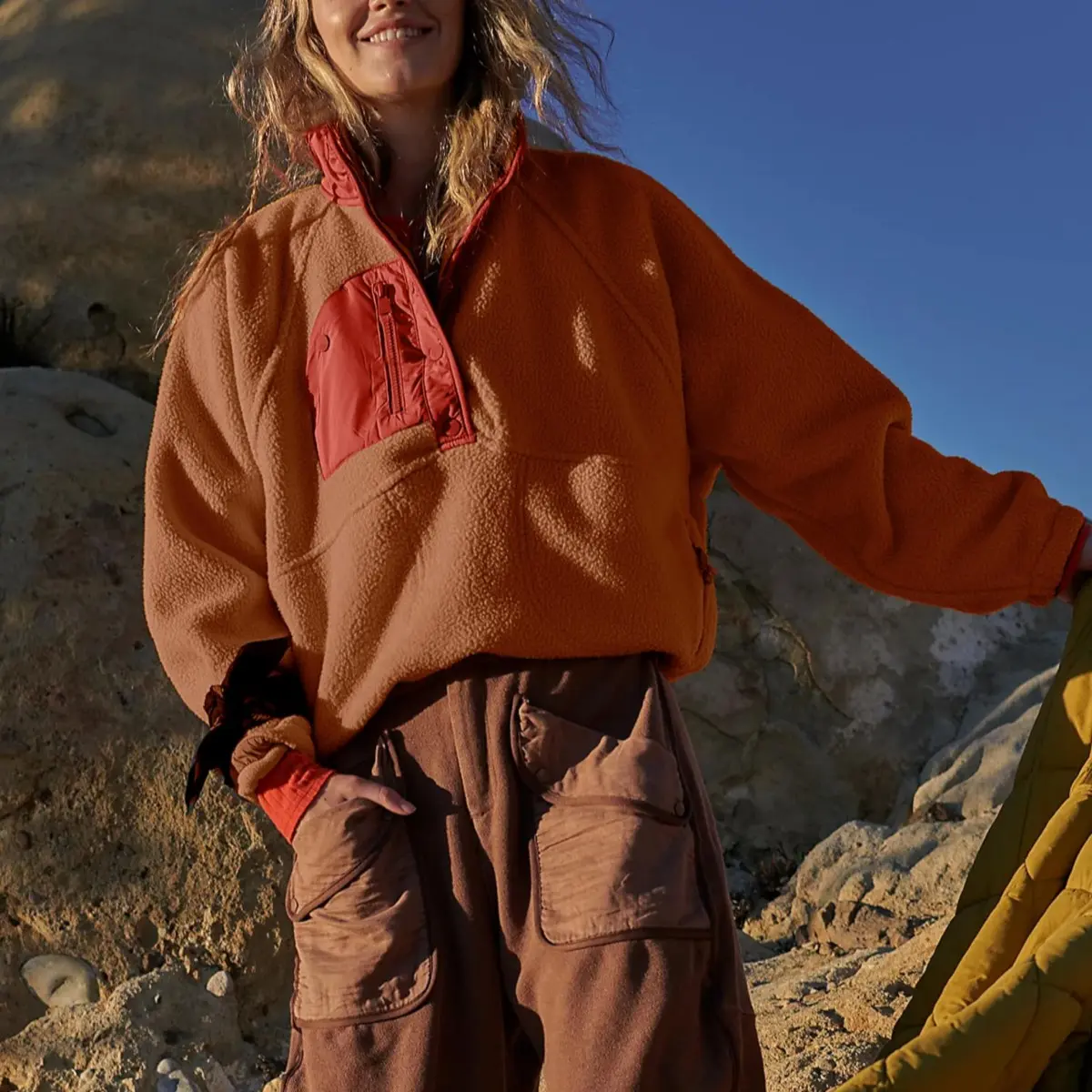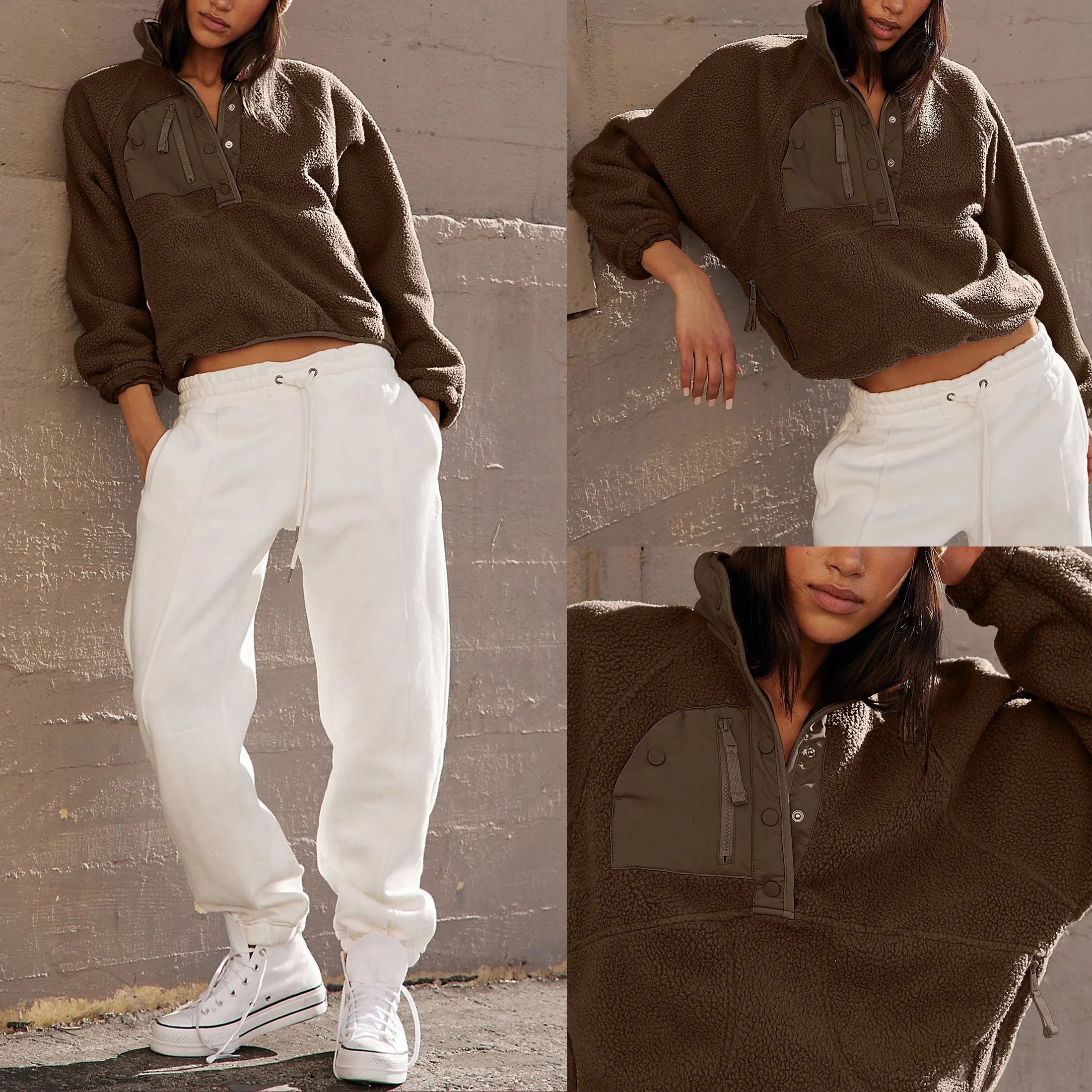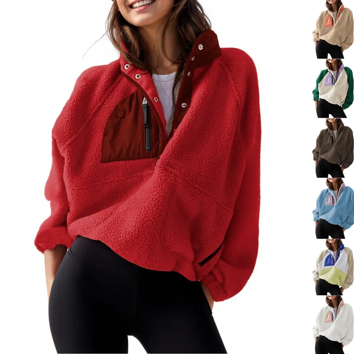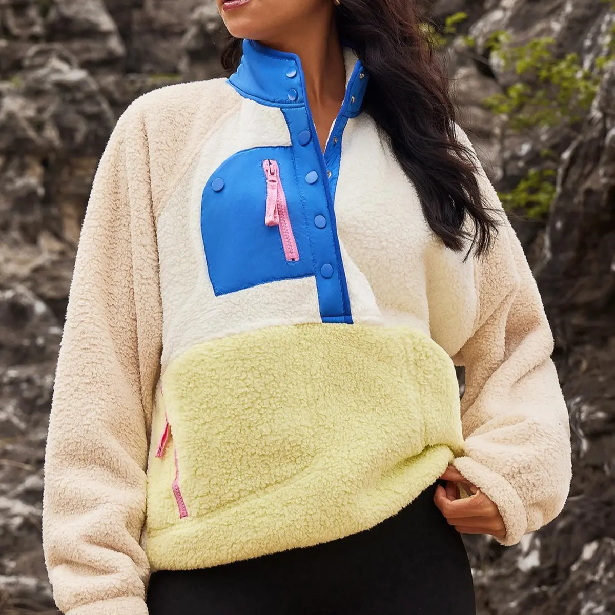 ·Casual trendy fuzzy fleece pullover Jacket for women, features with fashion color block design,stand collar, half snap button or lapel, raglan long sleeve, two side zipper pockets, cropped length, loose fit, a stylish fuzzy hoodie jacket outerwear in fall winter chilly day