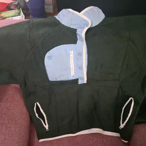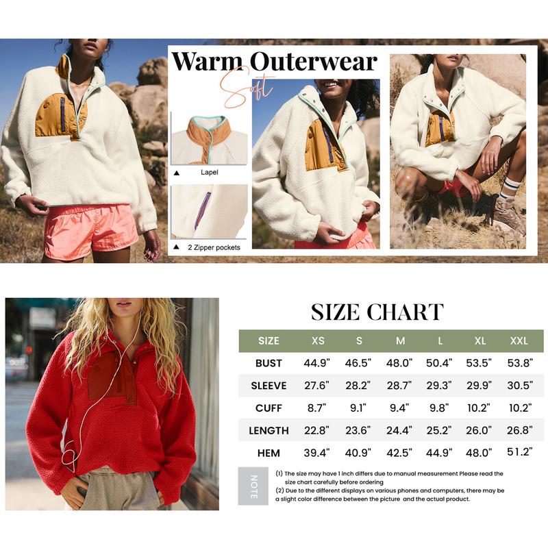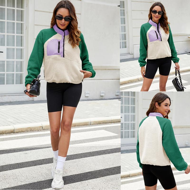 ¡Casual trendy fuzzy fleece pullover Jacket for women, features with fashion color block design,stand collar, half snap button or lapel, raglan long sleeve, two side zipper pockets, cropped length, loose fit, a stylish fuzzy hoodie jacket outerwear in fall winter chilly day