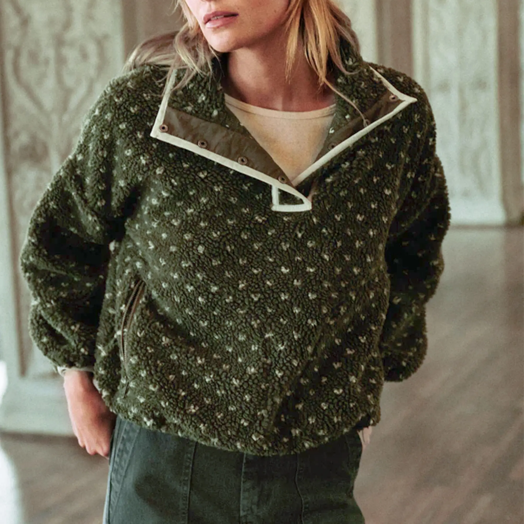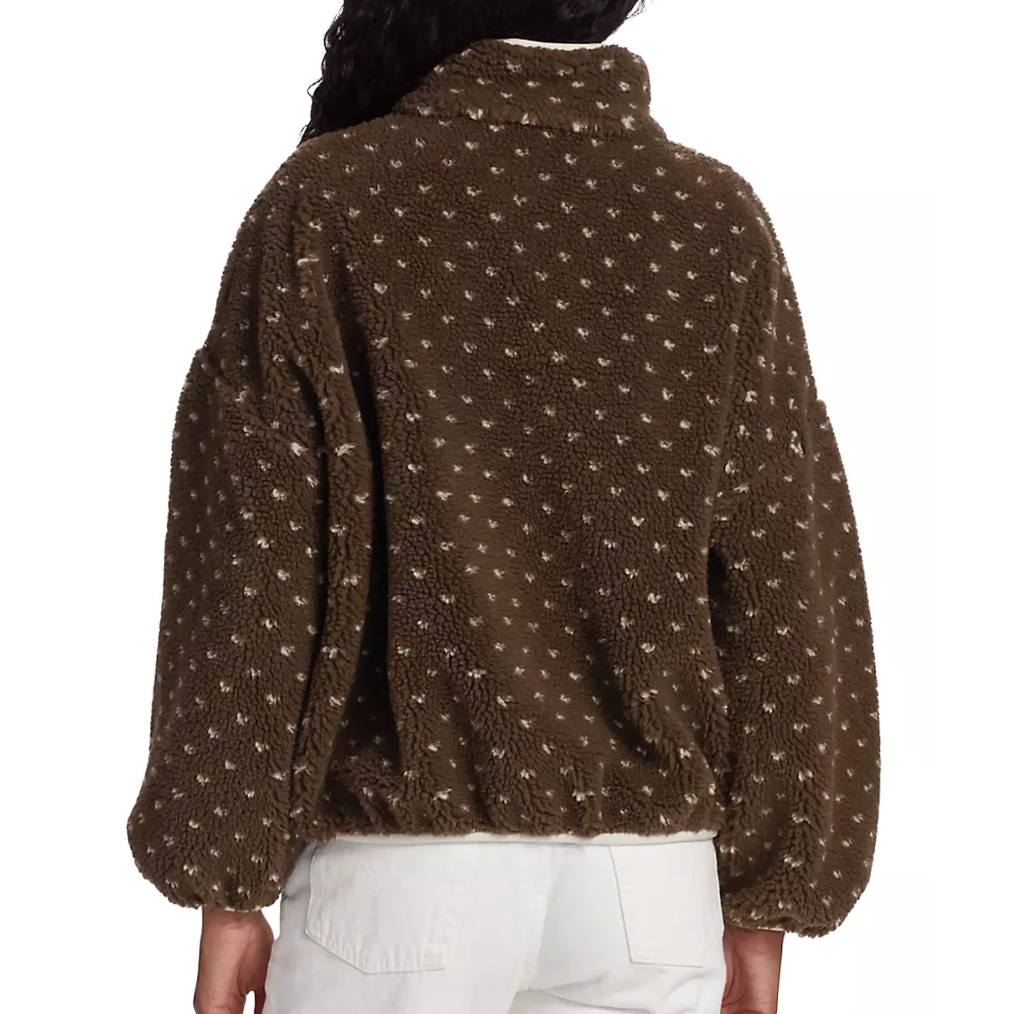 Feature: Trendy sherpa half button pullover tops, long sleeve sweatshirts, vintage jacquard print, heart check pattern, a funnel neckline with metal snaps for easy on and off, and contrast binding around the edges, 2 side zipper pockets, high neck for extra warmth