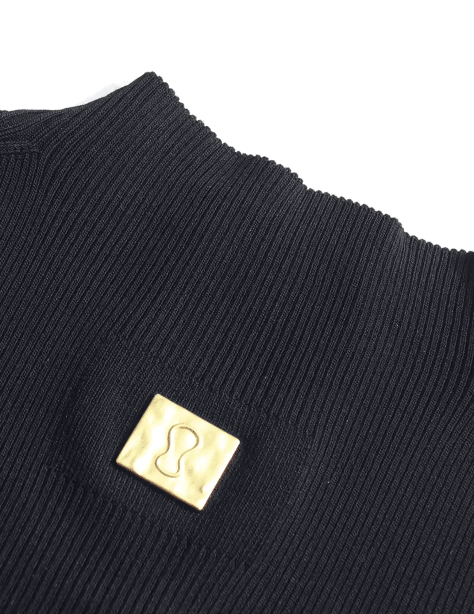 A high mock neckline frames the shoulders with clean sophistication, while the bold gold-tone keyhole hardware at the chest introduces a striking focal point. The subtle cut-out detail enhances the architectural feel, balancing edge and elegance. A coordinating gold hardware accent at the back adds a refined finishing touch.