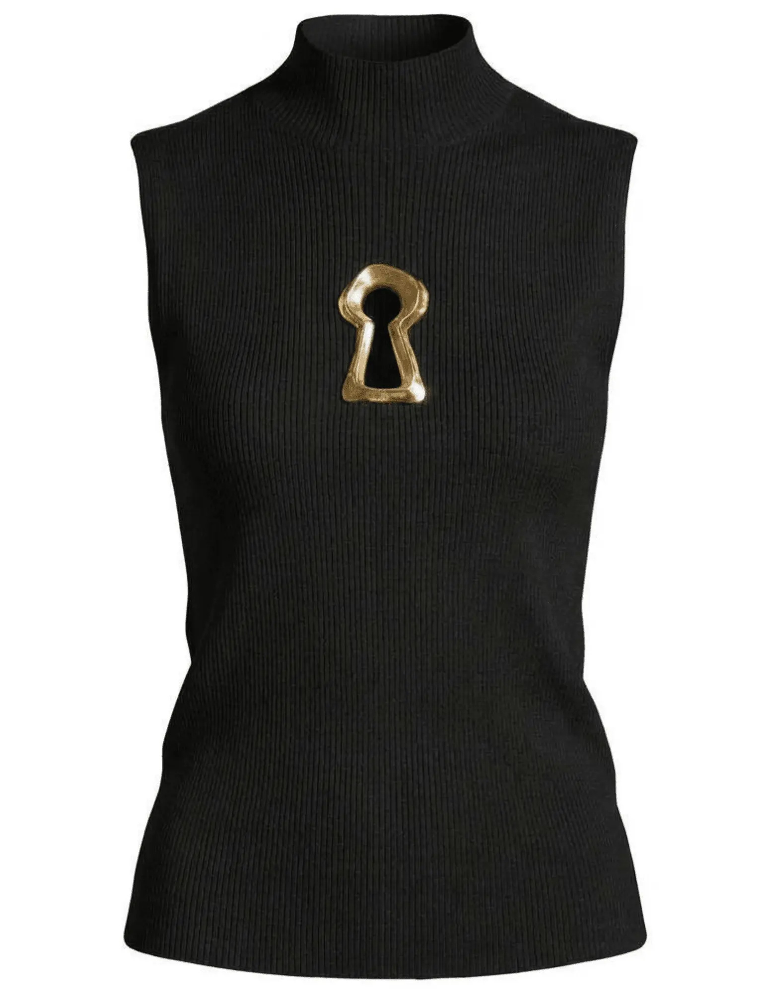 The structured keyhole hardware transforms a classic black tank into a sculptural statement piece — equal parts modern and timeless.
