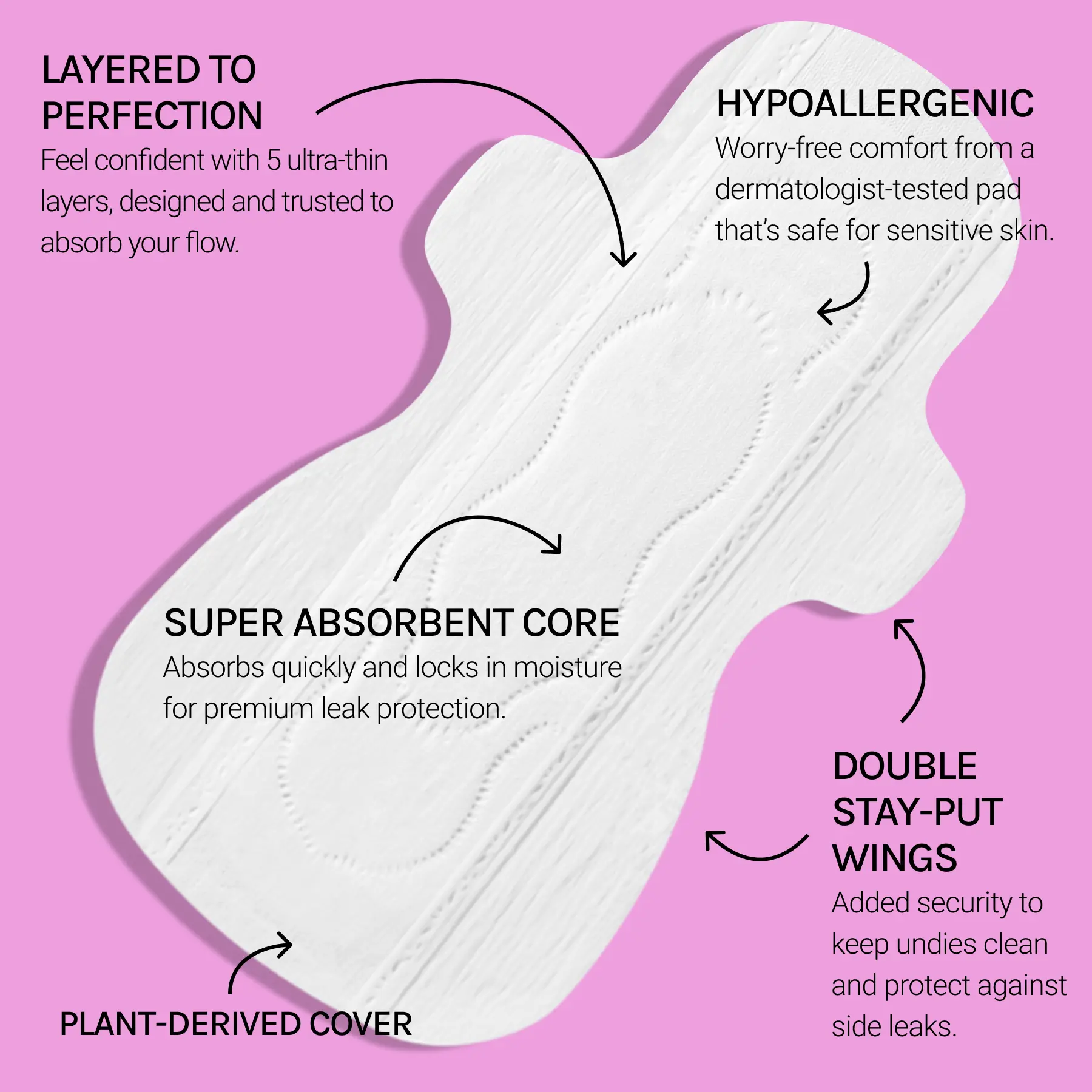 Designed for peace of mind (and sensitive skin). Our pads are dermatologist-tested, hypoallergenic, and free from fragrance, deodorants, herbs, dyes, elemental chlorine, and PFAS (forever chemicals).
