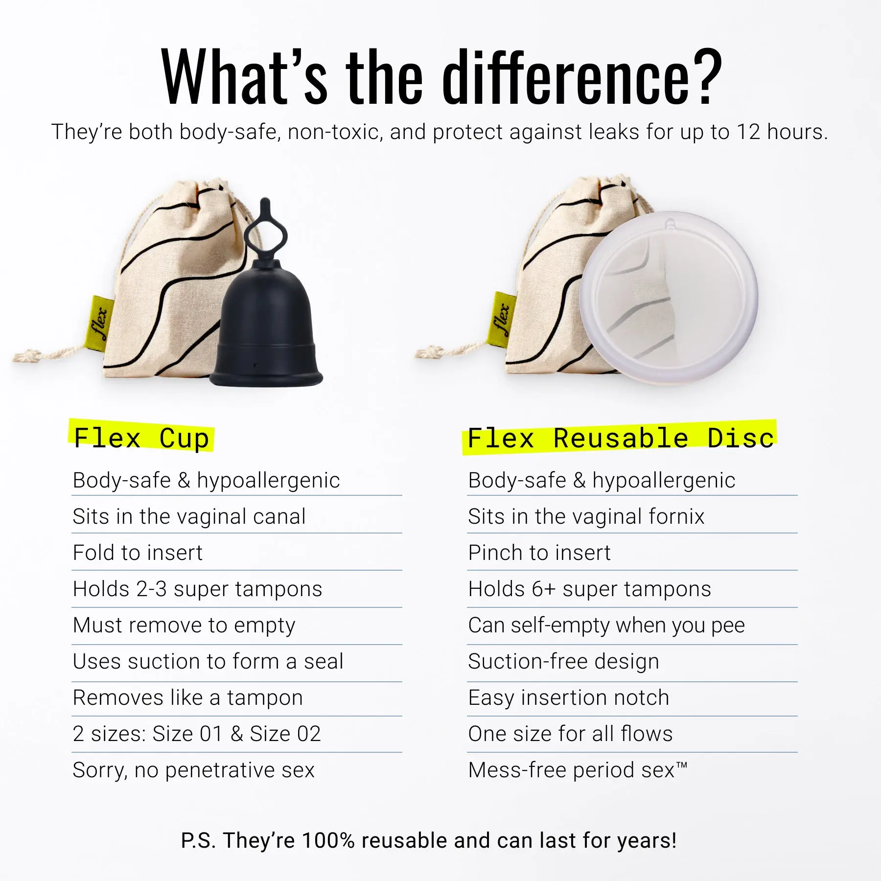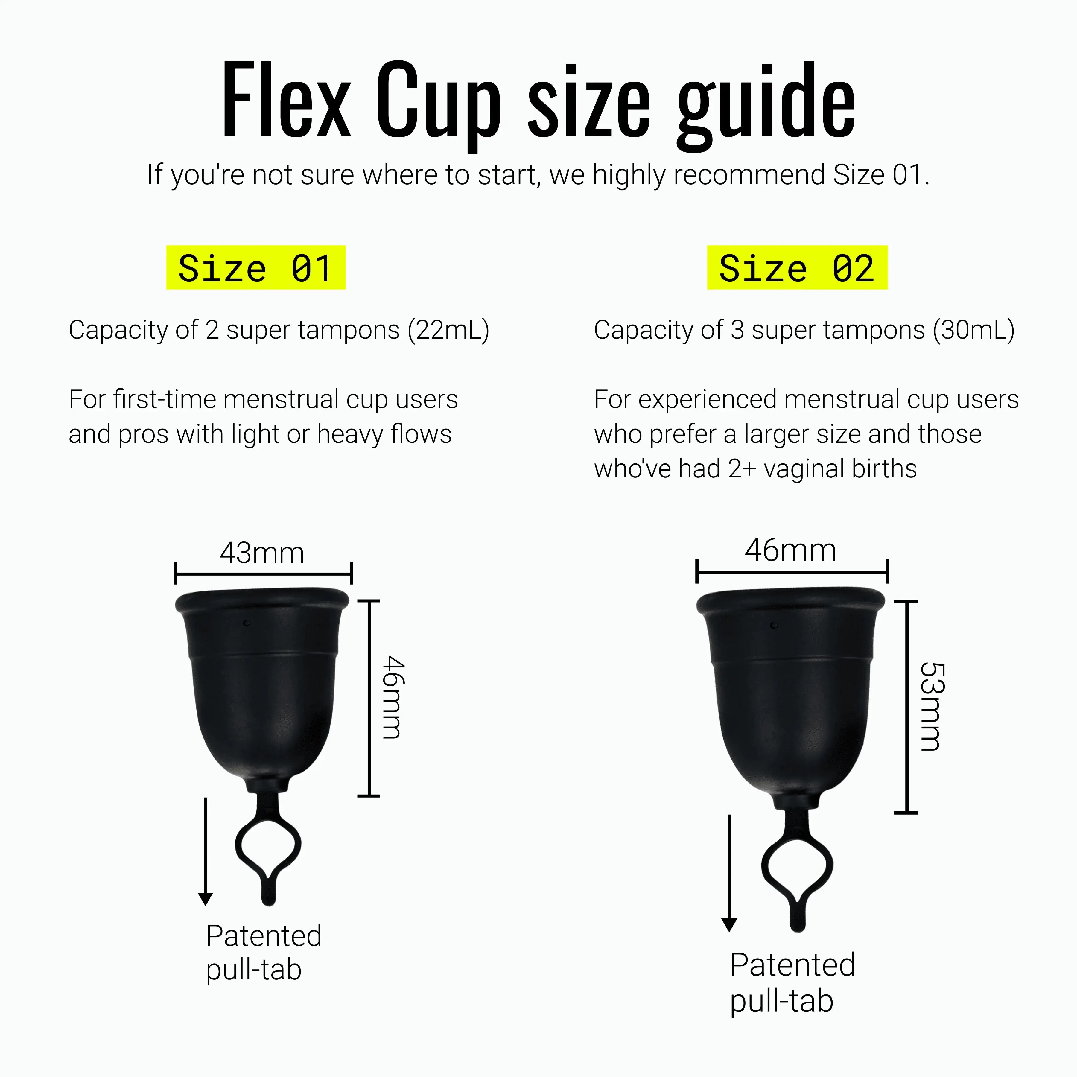 If you’re a first-time cup user, we recommend starting with the Flex Cup Size 01. If you’re a seasoned period cup pro, or if you’ve given birth vaginally 2+ times, we recommend Flex Cup Size 02. For most people, either size will work. It really comes down to choosing the best fit for your comfort.