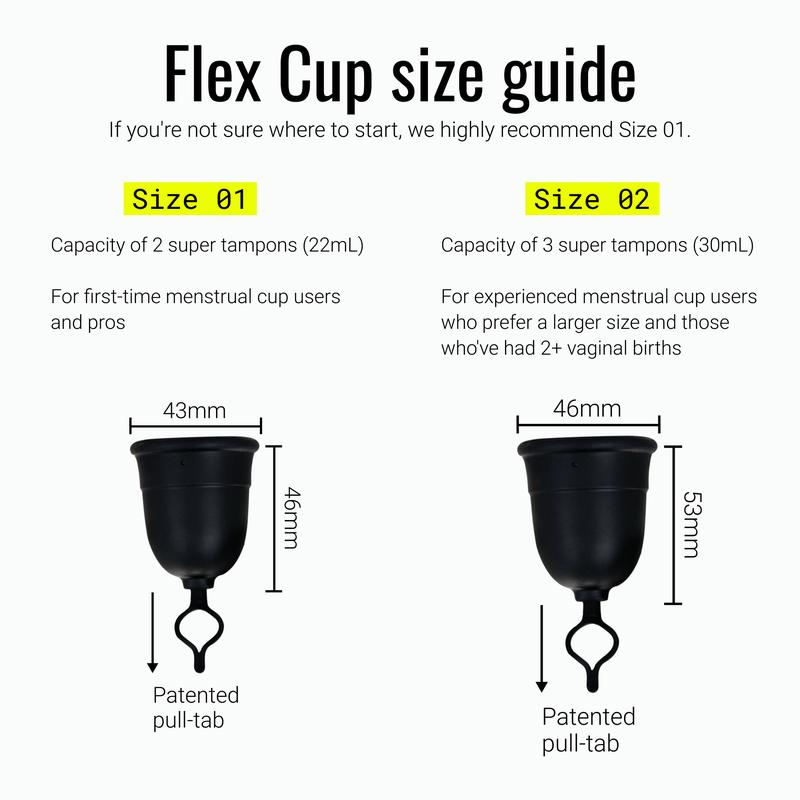 If you’re a first-time cup user, we recommend starting with the Flex Cup Size 01. If you’re a seasoned period cup pro, or if you’ve given birth vaginally 2+ times, we recommend Flex Cup Size 02. For most people, either size will work. It really comes down to choosing the best fit for your comfort.