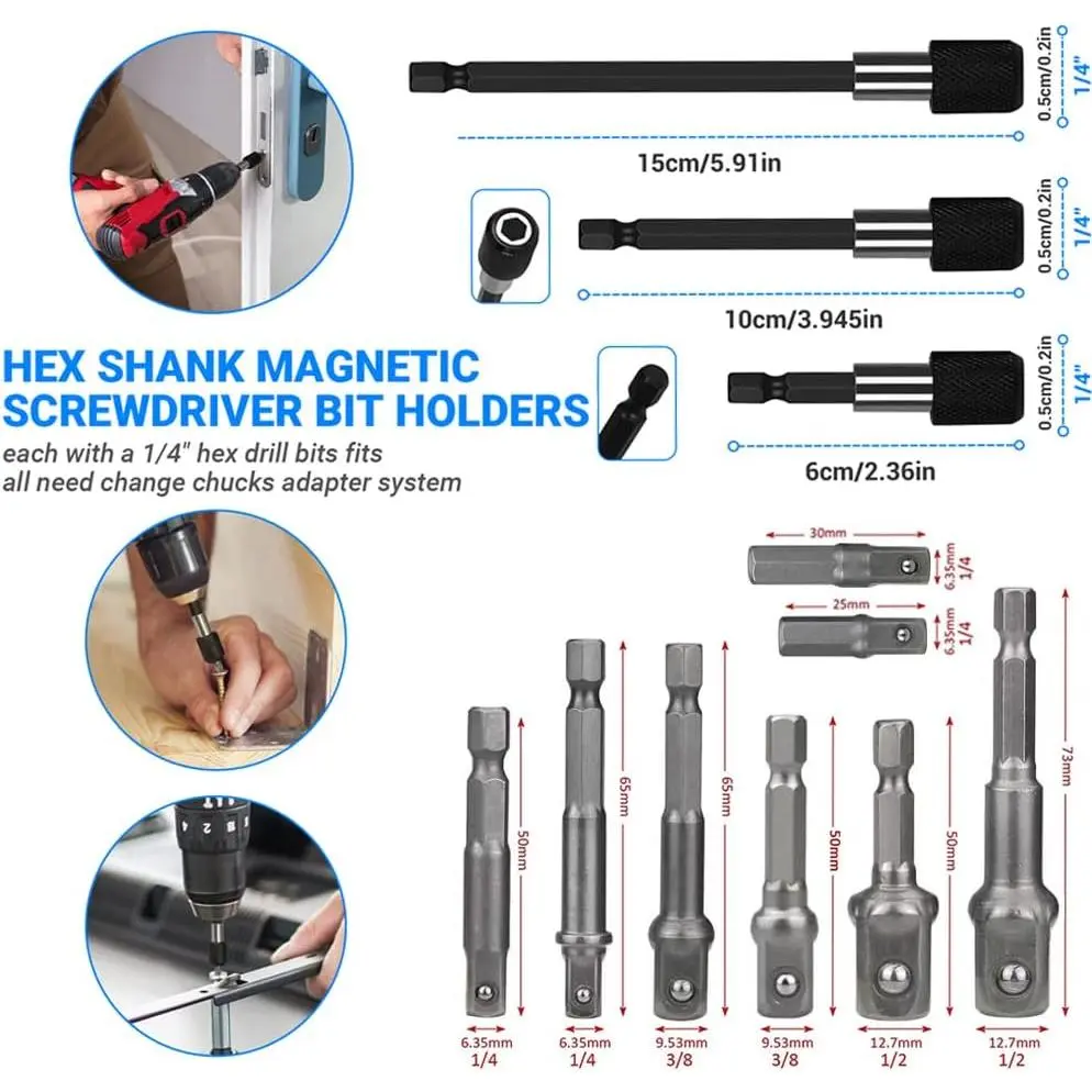 3 count Bit Holders: Include 3 x 1/4 Inch hex shank extension chuck adapter quick release bar socket bit holders, the lengths of which are 60 mm/100 mm/150 mm respectively. Suitable for electric, pneumatic screwdrivers and other bits of power tools, drill extended etc.