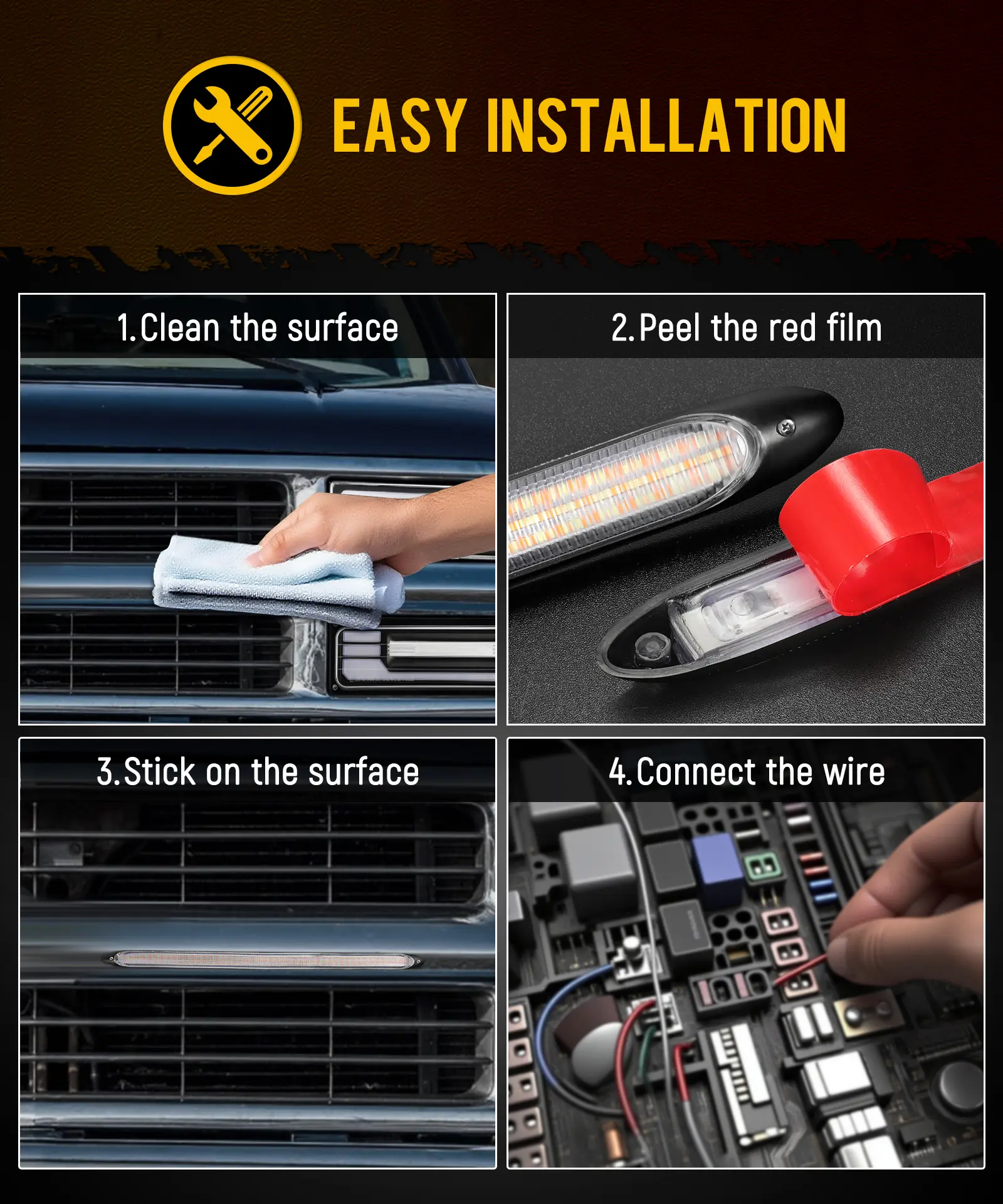 🔧 Simple Installation This product is designed for straightforward installation. Simply attach the strips to your vehicle's headlight area. Enjoy enhanced daytime visibility without compromising on functionality or aesthetics. Ideal for enhancing your car's safety during the day.