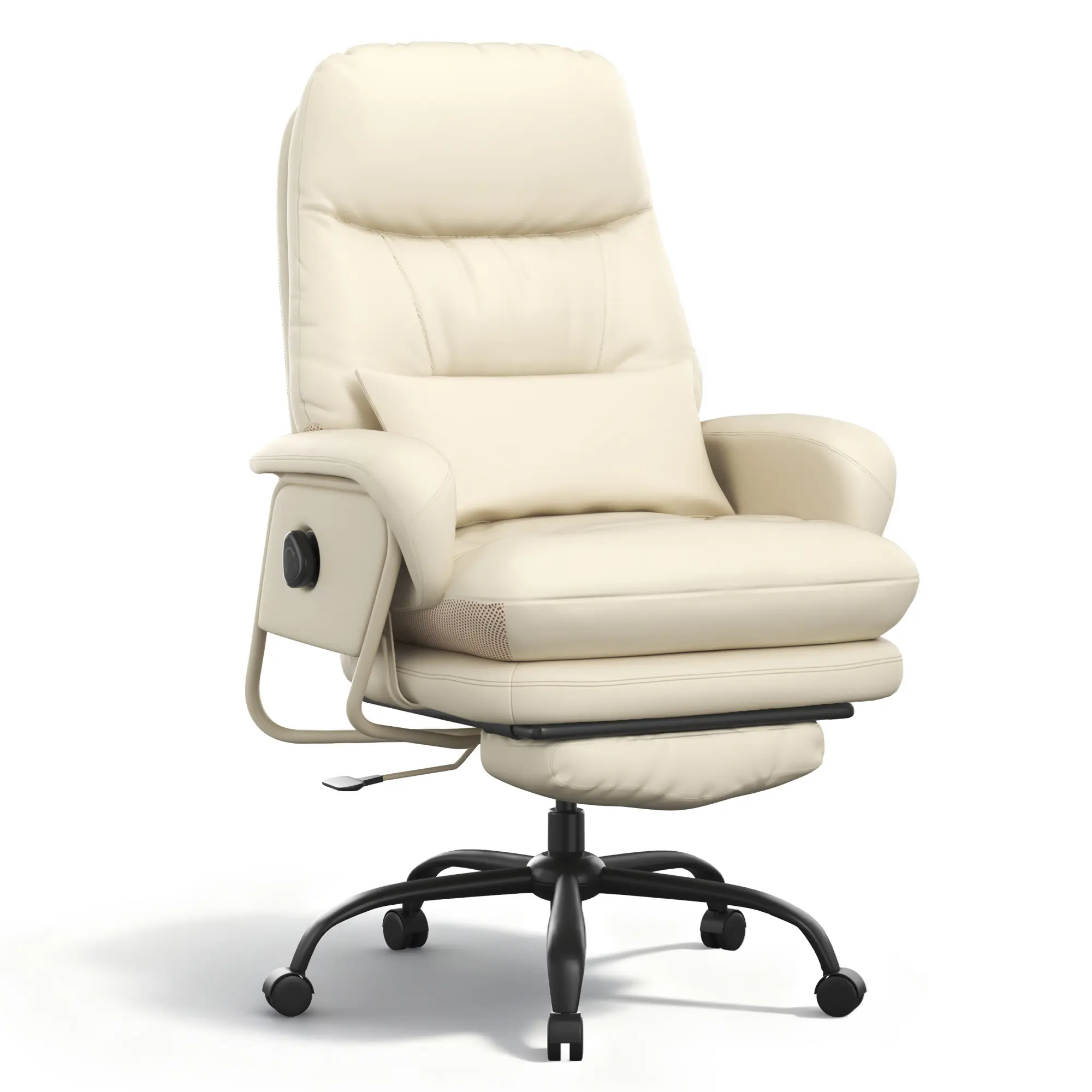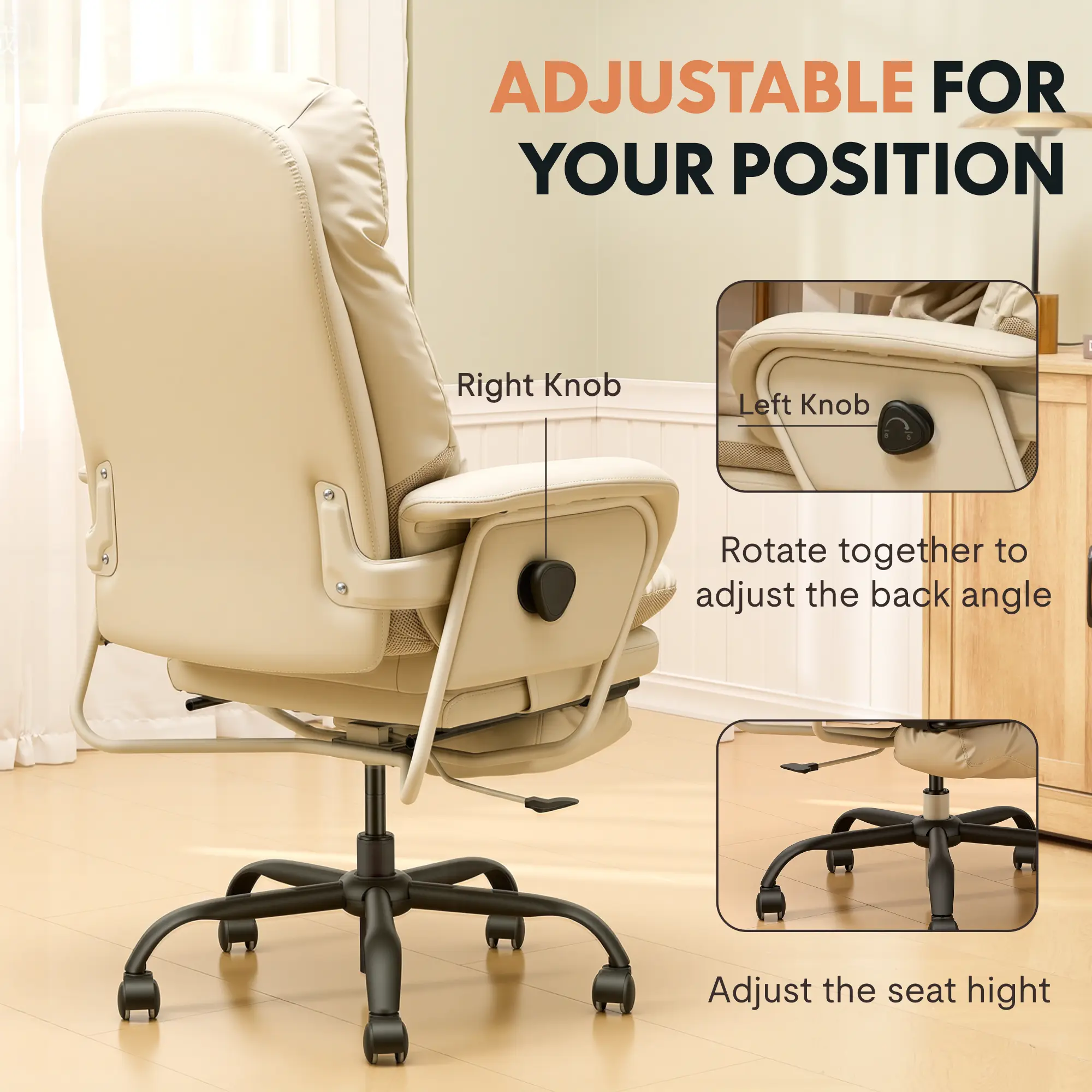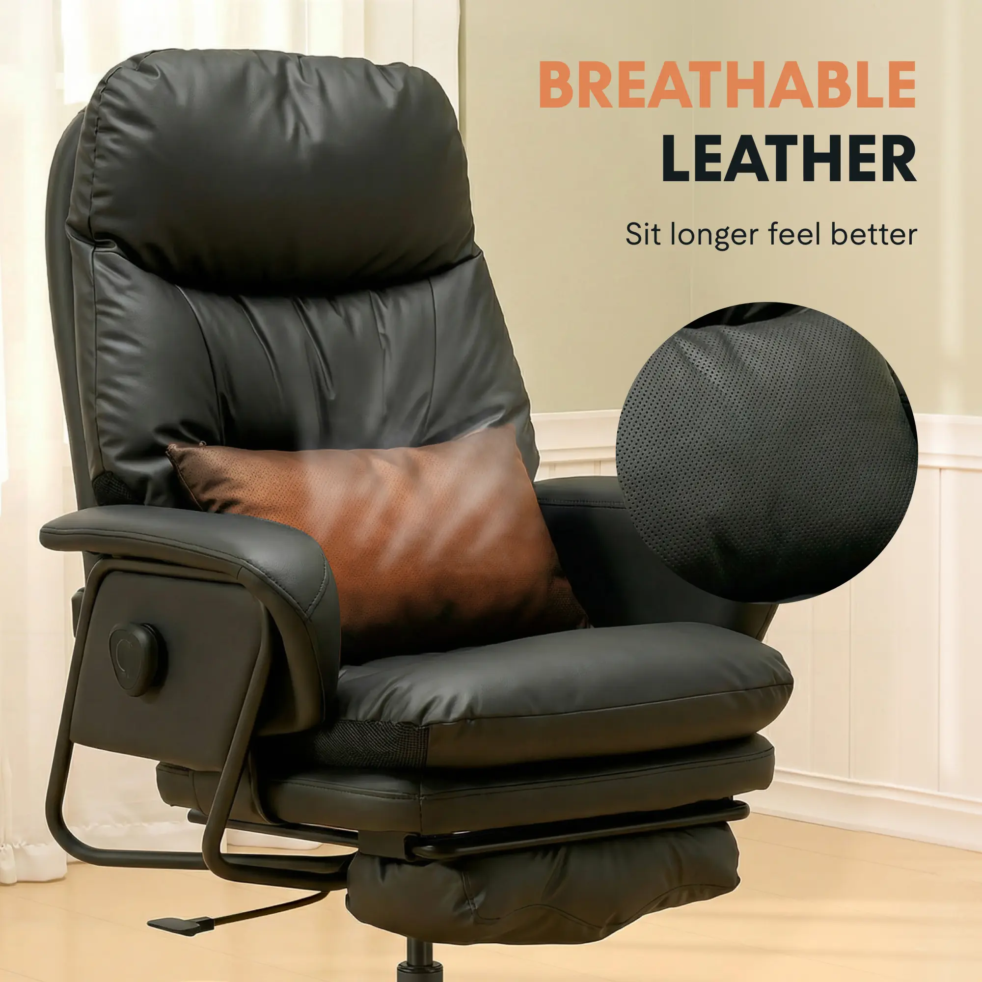 Built for durability with an SGS-certified gas lift and a reinforced frame supporting up to 400 lbs. The high-density foam with resilient springs is wrapped in premium breathable leather, staying cooler and more comfortable than standard materials.