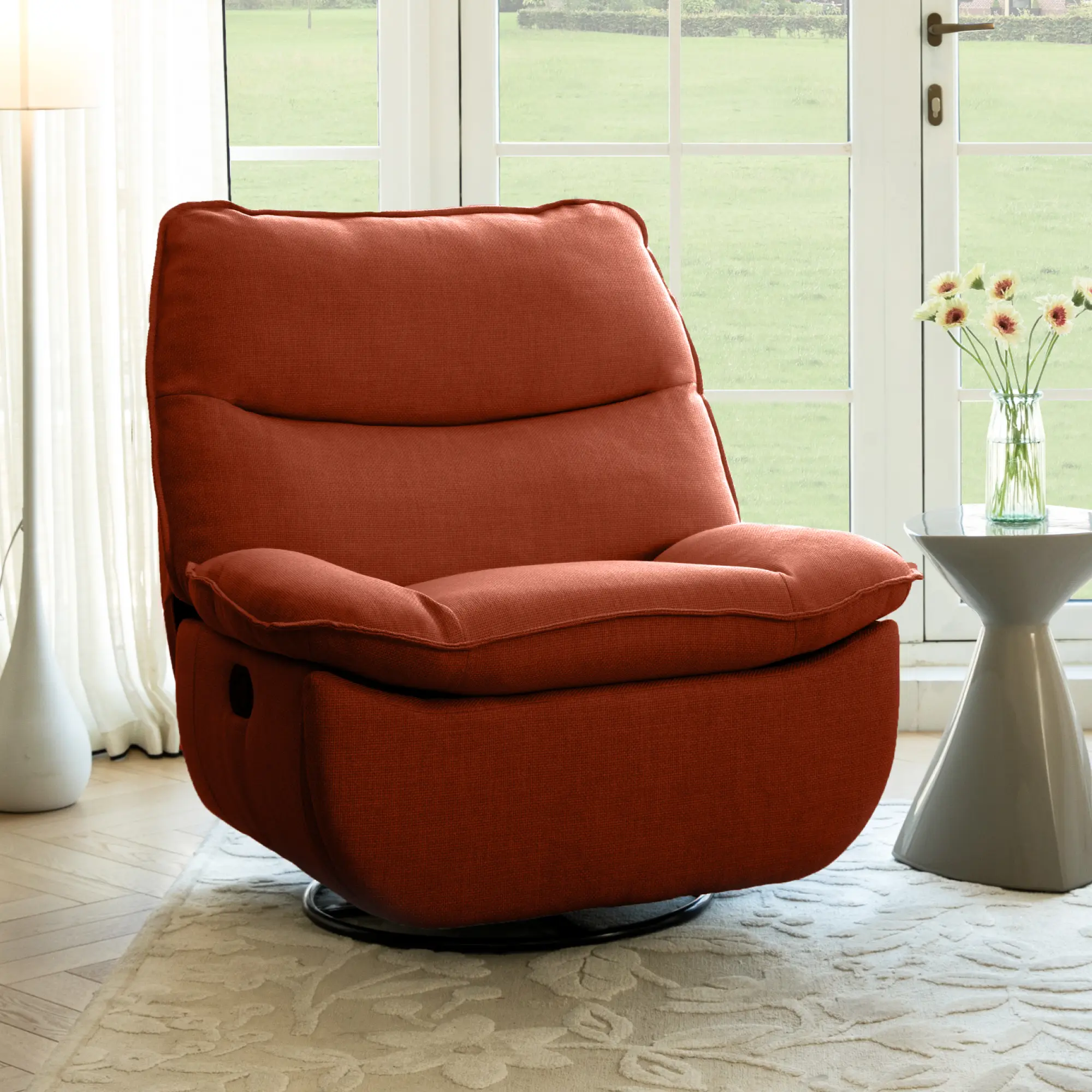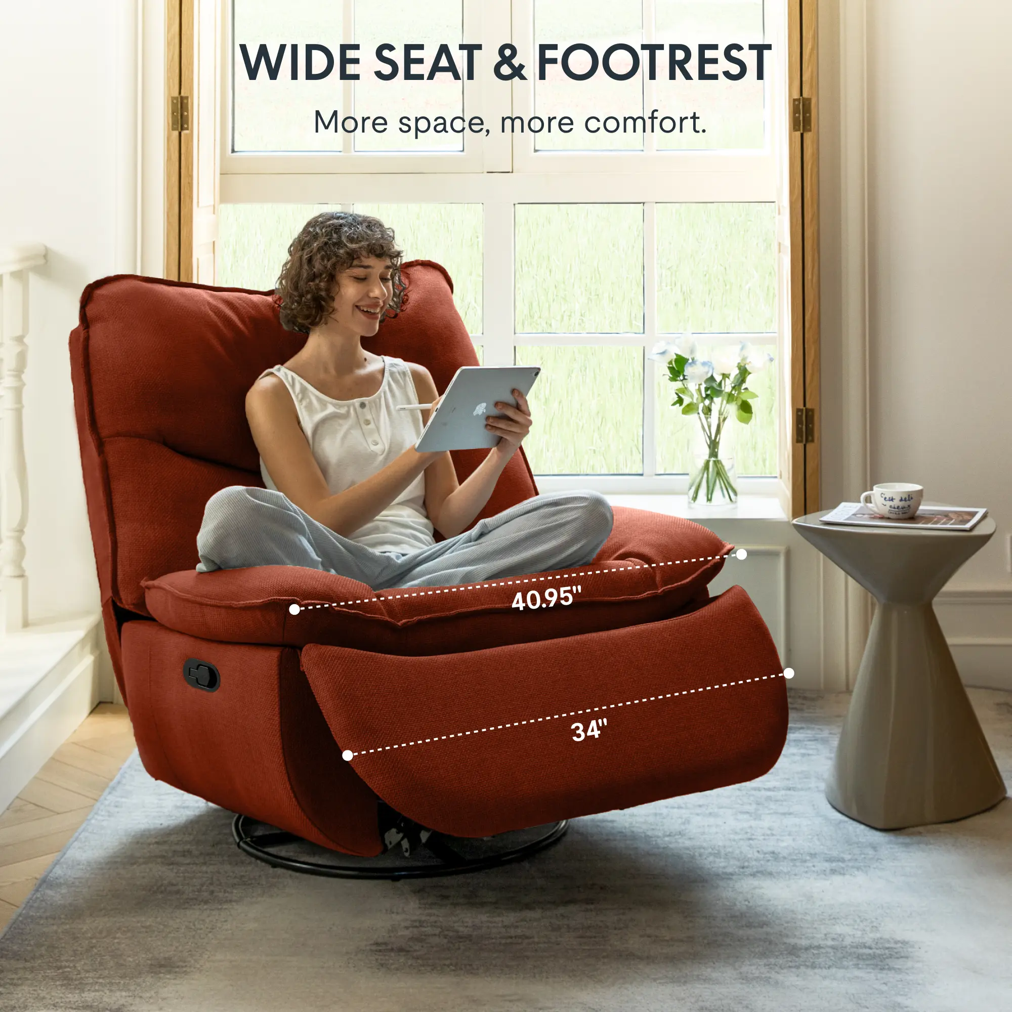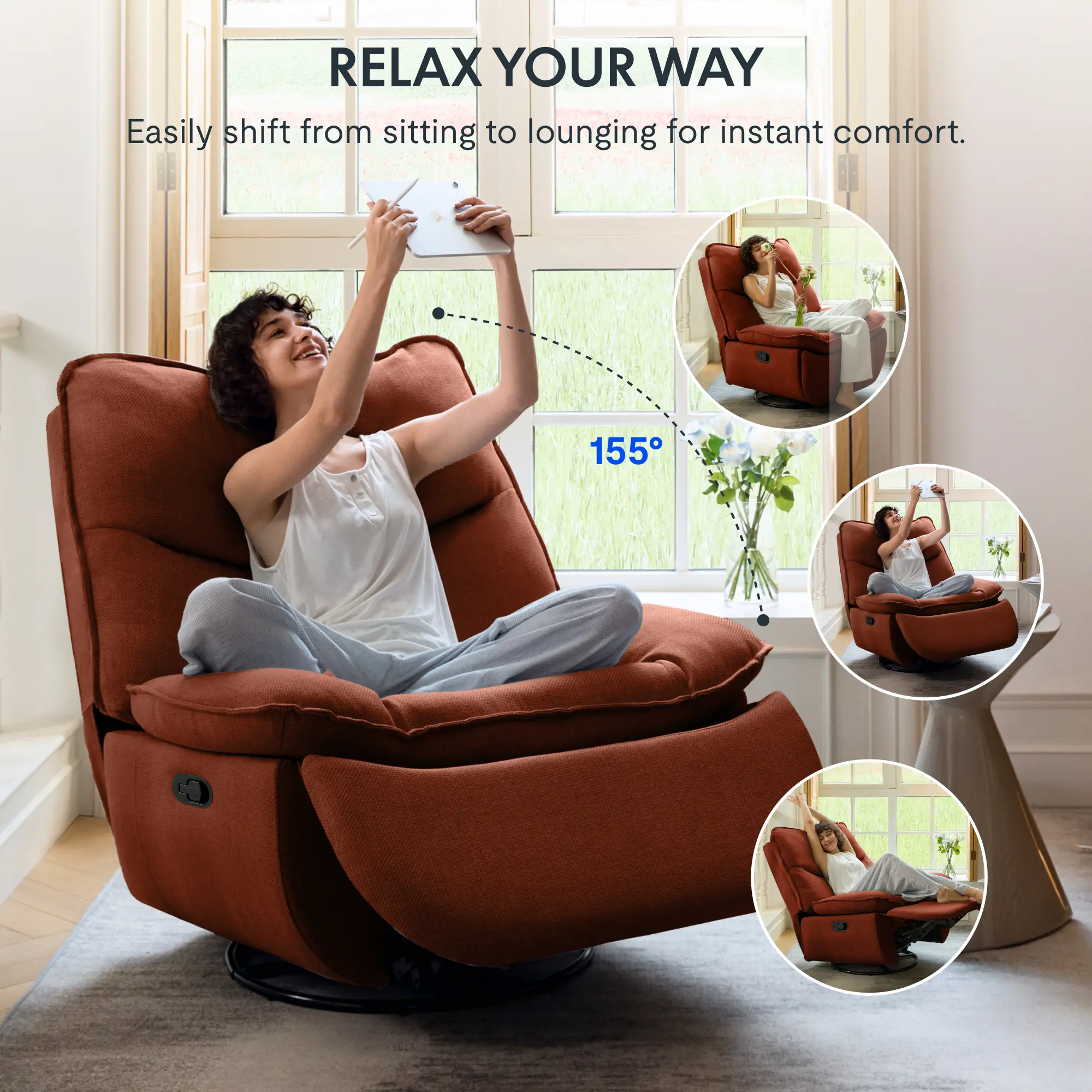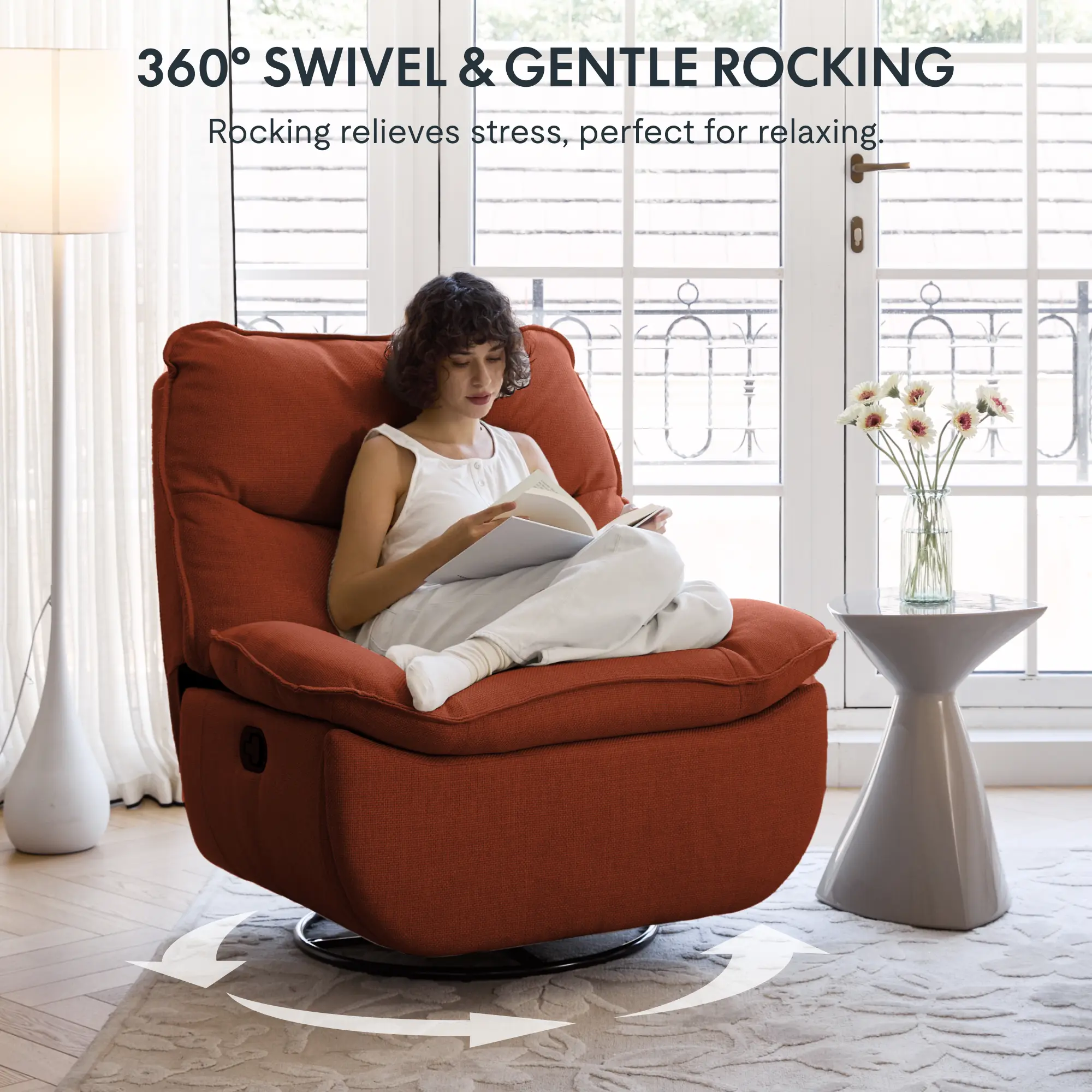 1. 【270° Swivel & Soothing Rocking Motion】 Equipped with a robust metal base, this chair offers a smooth 270-degree swivel and a gentle rocking feature. The adjustable backrest tilts from 113° to 145°, allowing you to transition effortlessly from upright reading to a deep, relaxed nap with the integrated footrest.