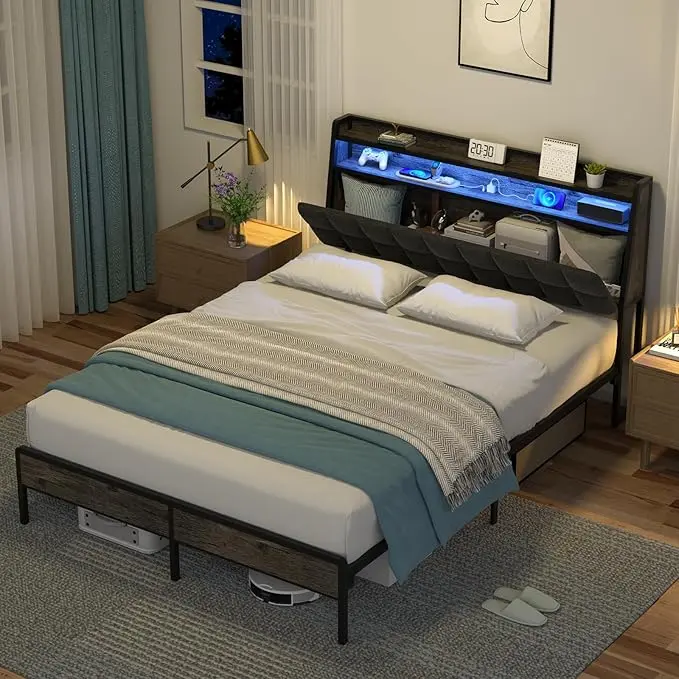 ·Multi-Function Storage: There are two places for storage: the headboard includes 2 tier storage shelves to keep small items like phones, glasses, and books within reach. The platform bed also features a 12" under-bed storage space, providing extra storage space for larger items and easy cleaning underneath.