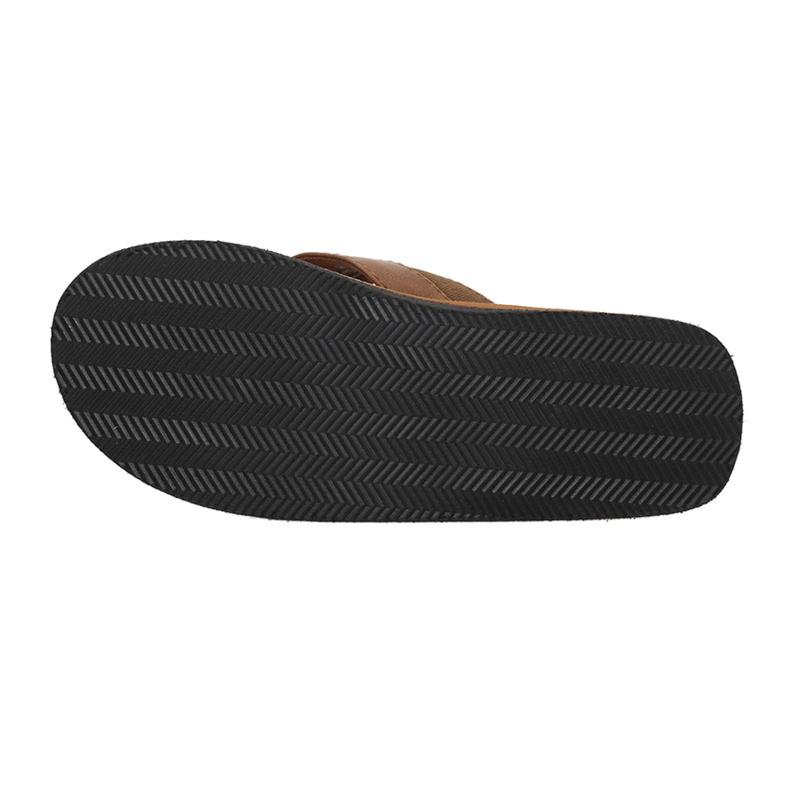 These flip flops have a die-cut Ethylene-vinyl acetate footbed with textured distressed vegan leather on top for comfort, and a thermoplastic rubber die-cut outsole for durability.
