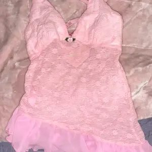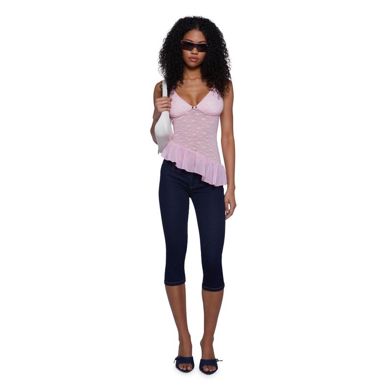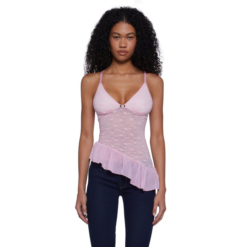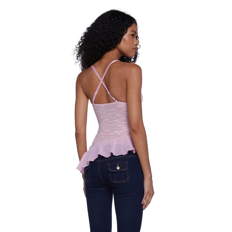 This top has a sheer textured puckered lace construction, a lined bust, a decorative rosette in the center, adjustable criss cross straps, a V-neckline, and an asymmetrical chiffon hem.