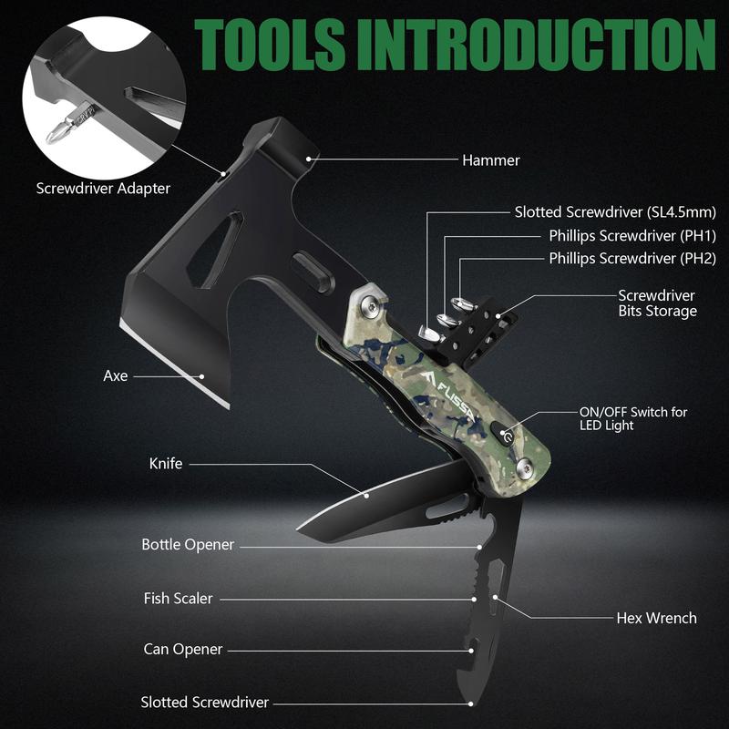 ·13-in-1 Multi Tool: The multitool offers an impressive variety of accessories, including axe, hammer, screwdriver adapter & bits storage, slotted screwdriver (SL4.5mm), Phillips screwdriver (PH1 & PH2), hex wrench, knife, bottle & can opener, fish scaler, slotted screwdriver.