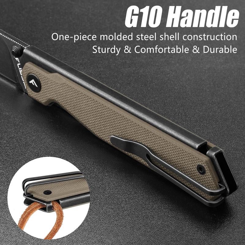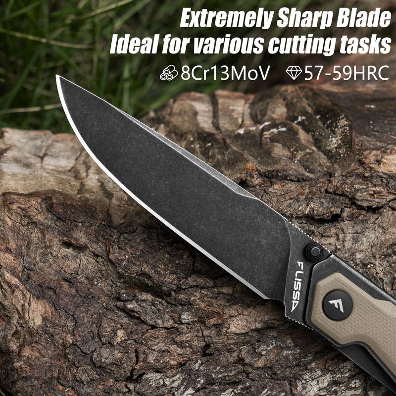 ·𝐑𝐚𝐳𝐨𝐫 𝐒𝐡𝐚𝐫𝐩 𝐄𝐝𝐠𝐞: The blade material is 8Cr13MoV which offers high hardness and toughness. Incorporating the FLISSA proprietary open edge technology, this knife offers great sharpness and durability. Whether as a camping knife for outdoor activities or an EDC knife for everyday use, this knife delivers precise and fast cutting experience.