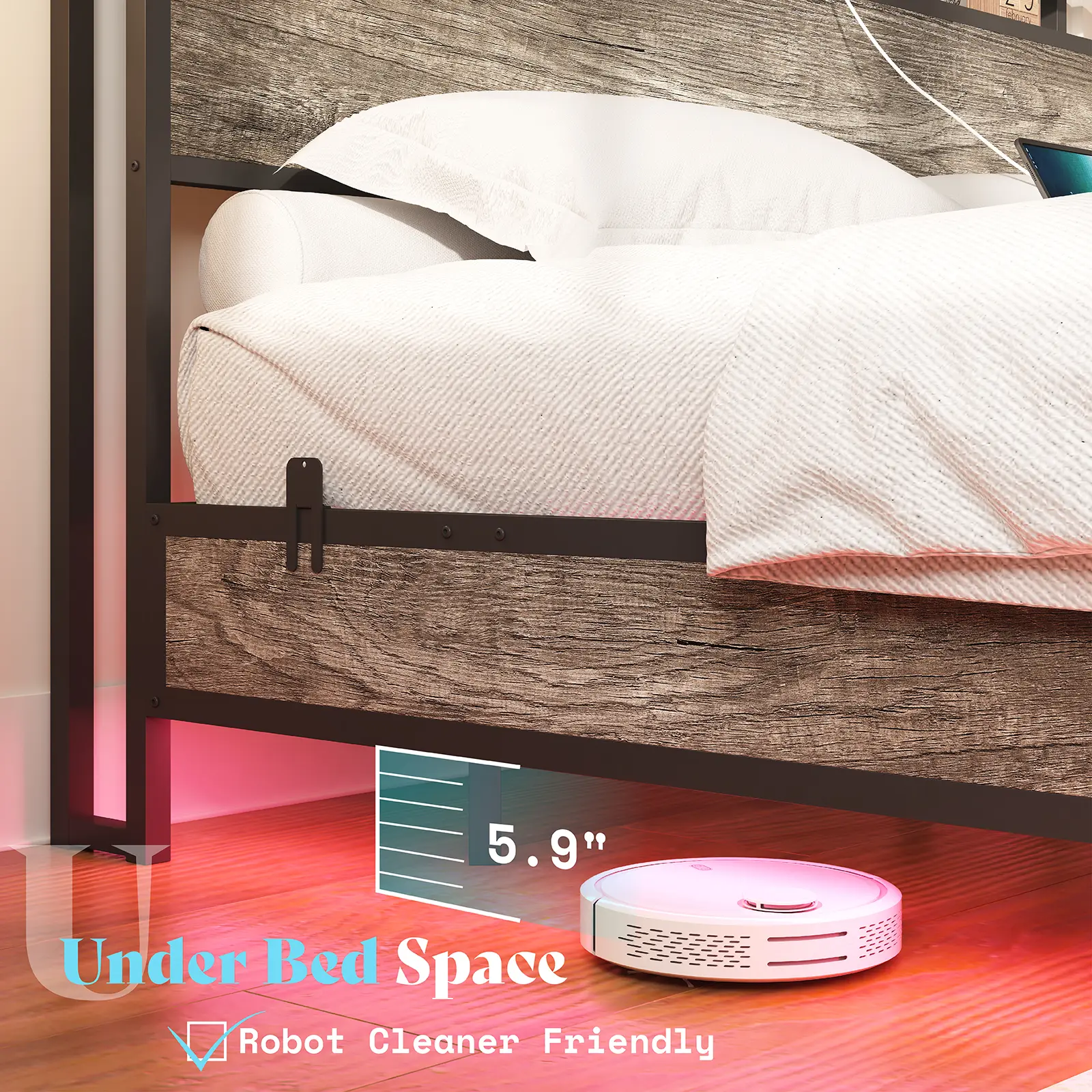 【Floating Bed Frame】Hidden support bars ensure maximum safety and stability, creating a balanced floating effect. Instantly open up floor space, making your room feel more spacious and free-flowing