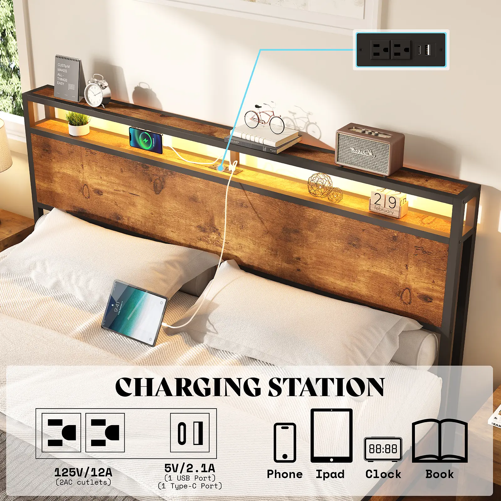 • 【Storage Headboard with Charging Station】Features 2 outlets, 1 USB port, and 1 Type-C port, 2-Tier headboard offers ample storage for your phone, tablet, alarm clock and lamp