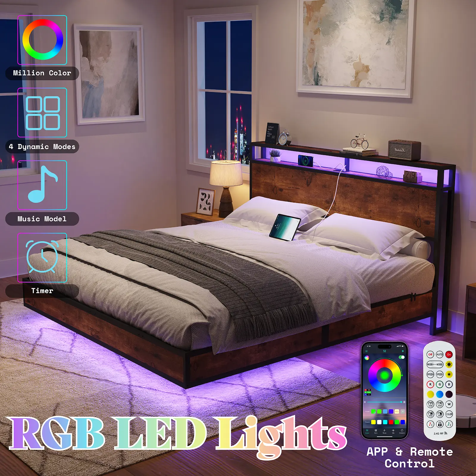 • 【Led Bed Frame】Features LED lights on the headboard and both sides, controllable via remote and mobile app. Choose from multiple colors to enhance your nighttime ambiance