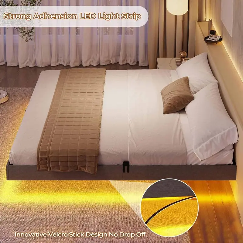 5. Sikaic Floating Bed Frame Linen Upholstered Platform With LED Lights Underbed Storage Space Dark Grey Angersbed Modern Headboard Unique Bedroom Furniture