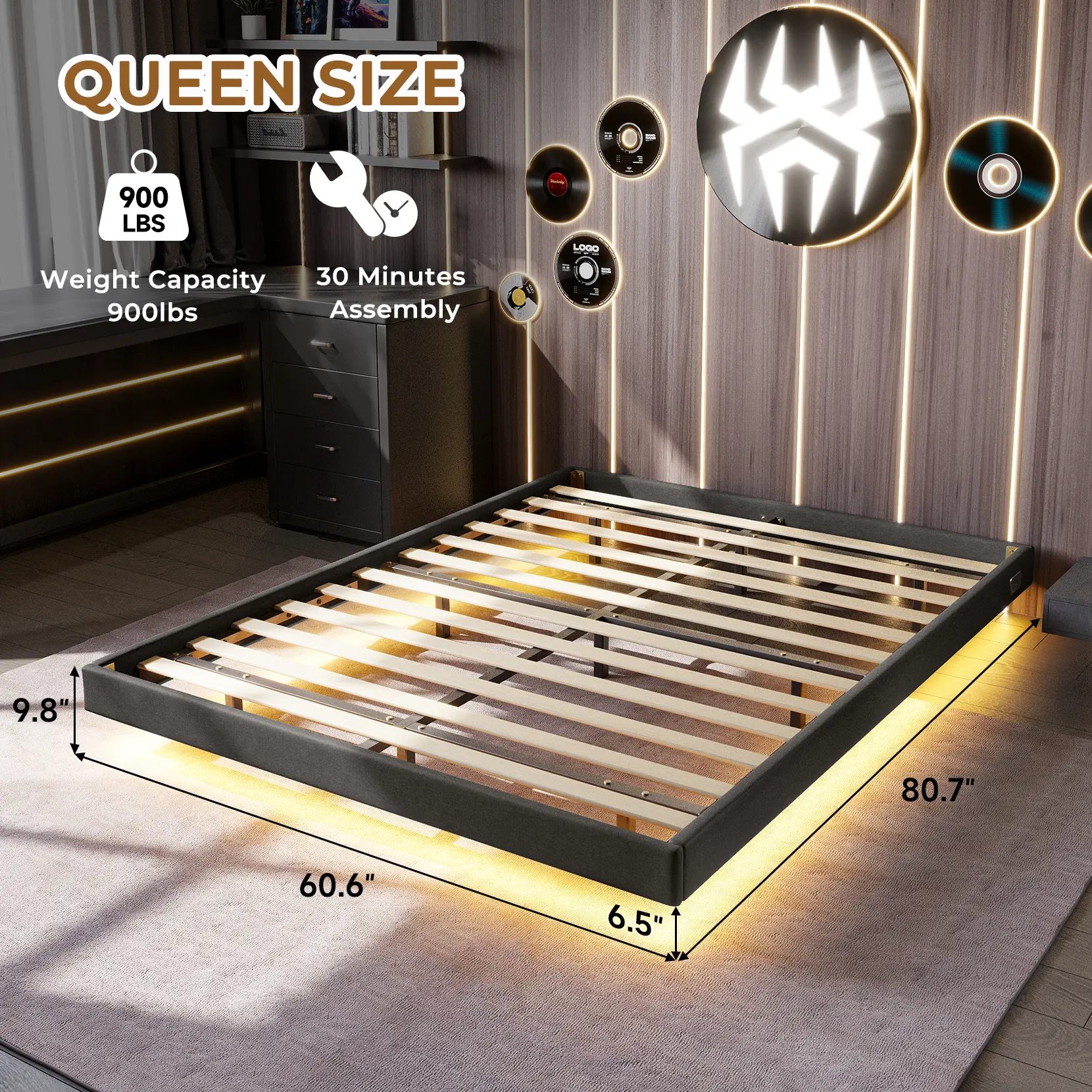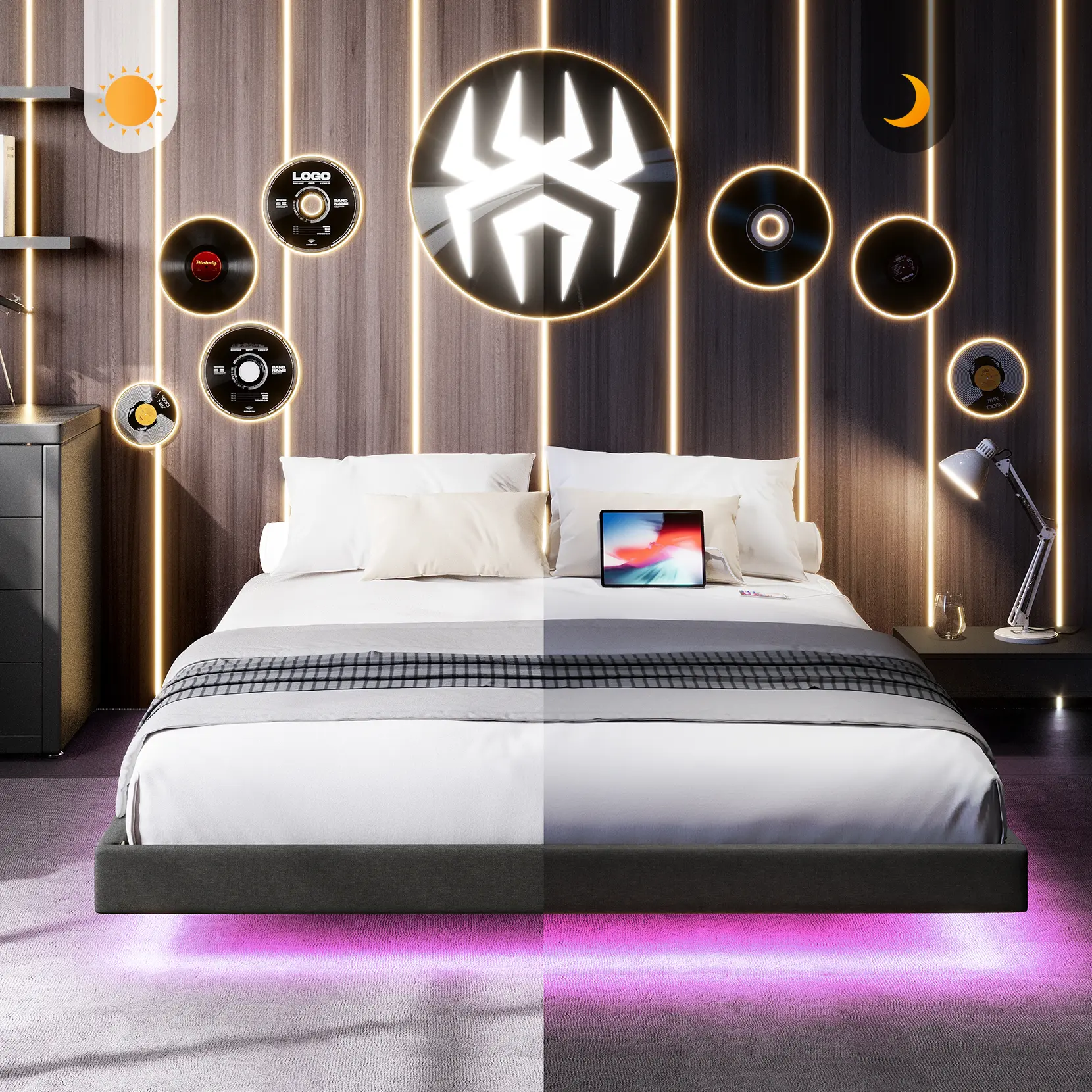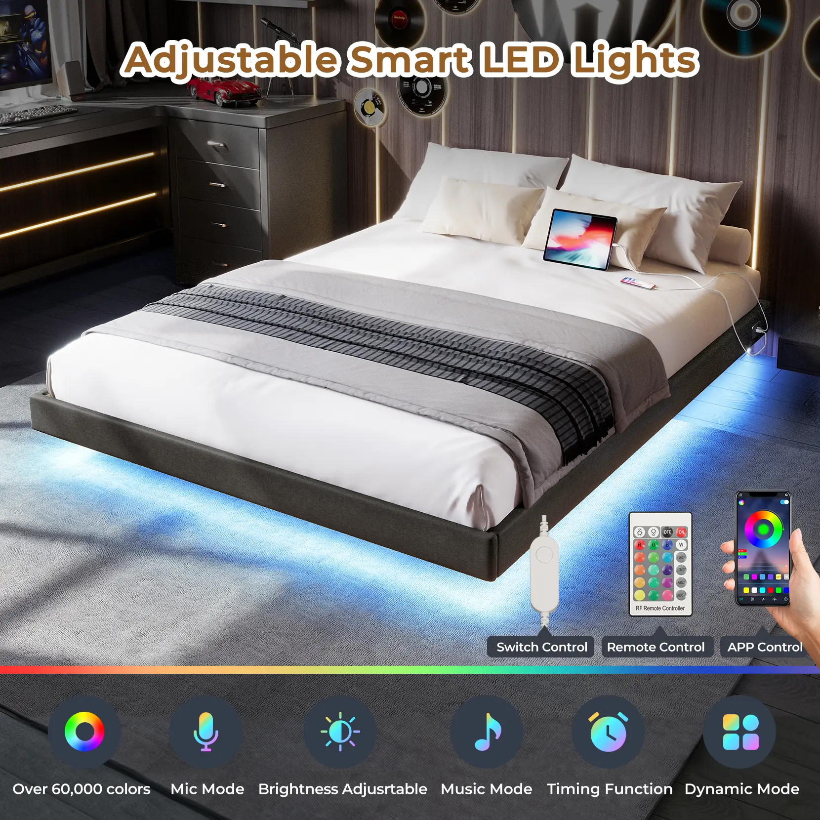 ·【Modern Fabric Floating Bed】Soft fabric wrapped floating bed frame is different from the traditional bed frame design, its unique hidden foot makes the bed frame looks like suspended in the air, with the use of intelligent LED lights under the bed, not only anti-kick legs and more technological sense!There's even less to be afraid of when you get up in the dark!