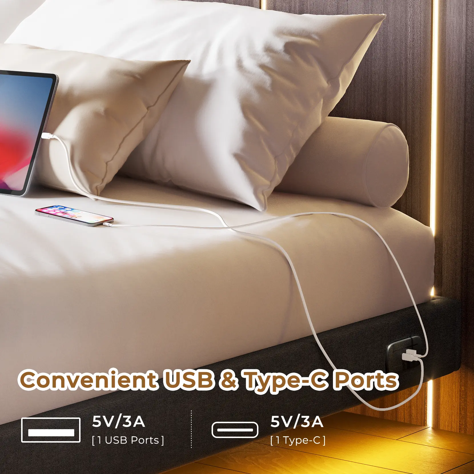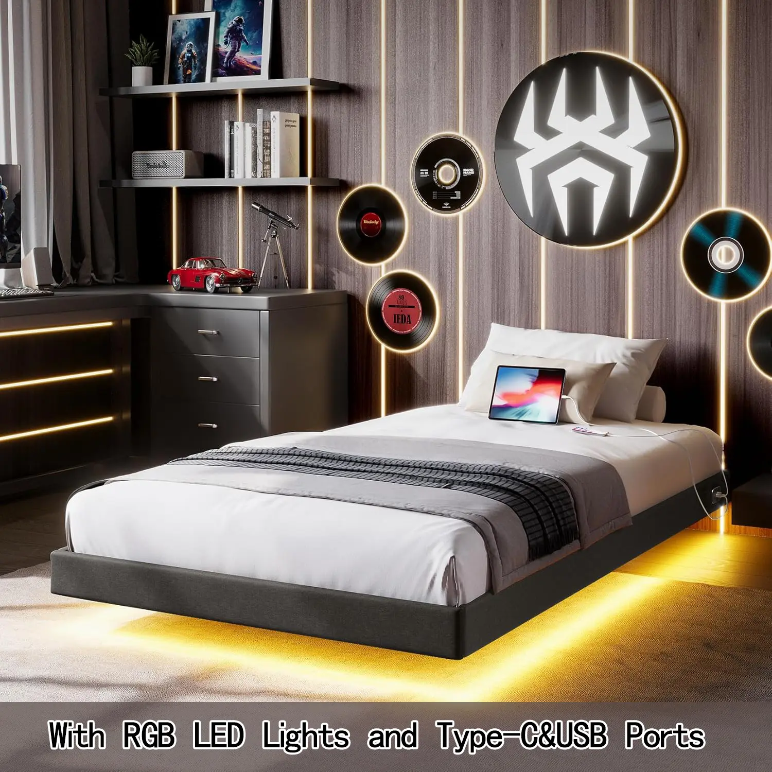 ·【Type-C & USB Charging Ports】The floating bed frame has two built-in charging stations, including USB and Type-C ports (compatible with Android and iPhone), which allows you to use your cell phone, tablet, desk lamp and other devices at the same time, but without the need for an outlet. Realize a better lying entertainment experience.