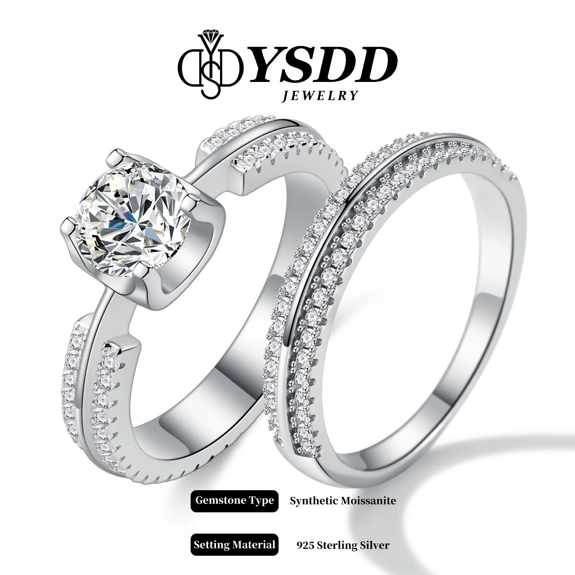 【#366】1CT Deluxe Classic Four-prong Floating Synthetic Moissanite Rings in 925 Sterling Silver with Matching Band