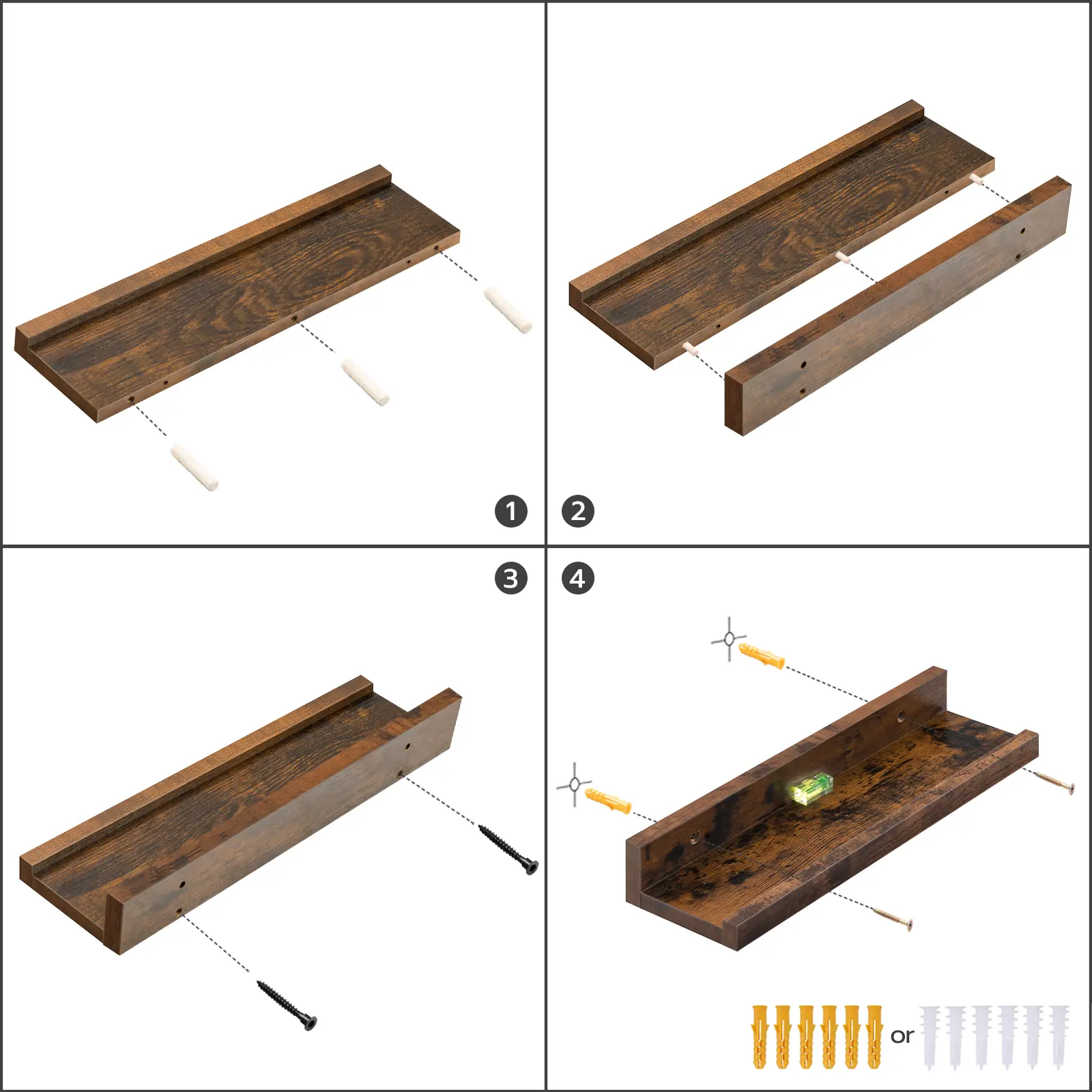 It includes two types of expansion screws to ensure the ledge can be securely hung on the wall, whether the wall is concrete or hollow brick.